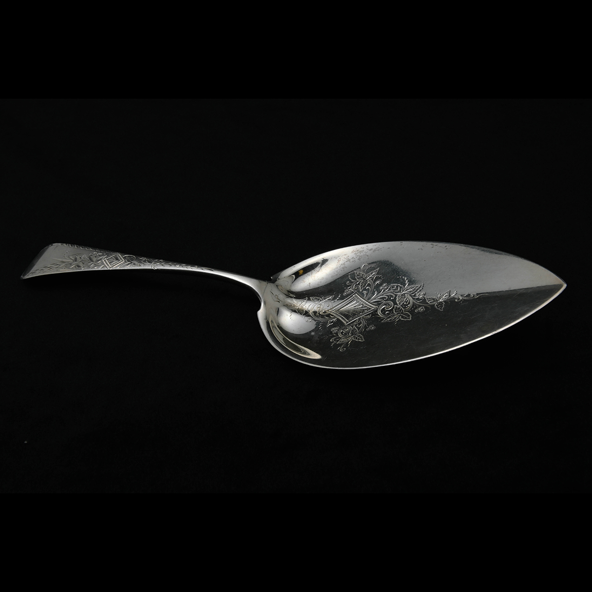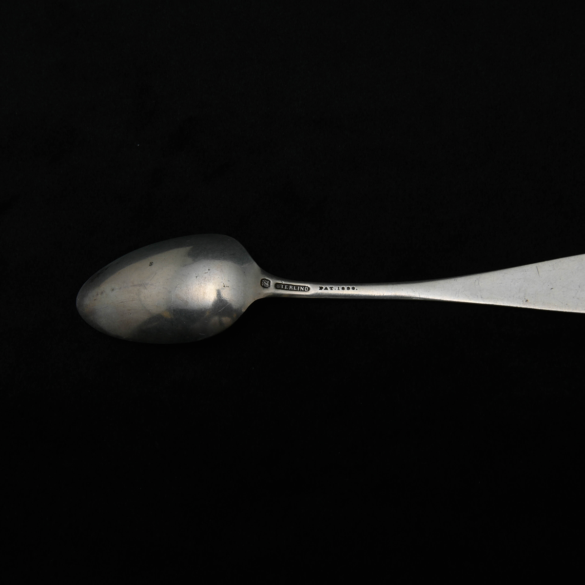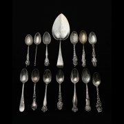 Including seven souvenir spoons by Wallace, Durgin, etc. for Atlanta Los Angeles Chicago, etc. a Merry Christmas spoon five additional spoons and a Gorham ice cream spade with bright engraved pattern.
