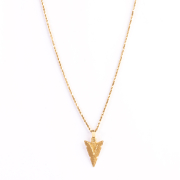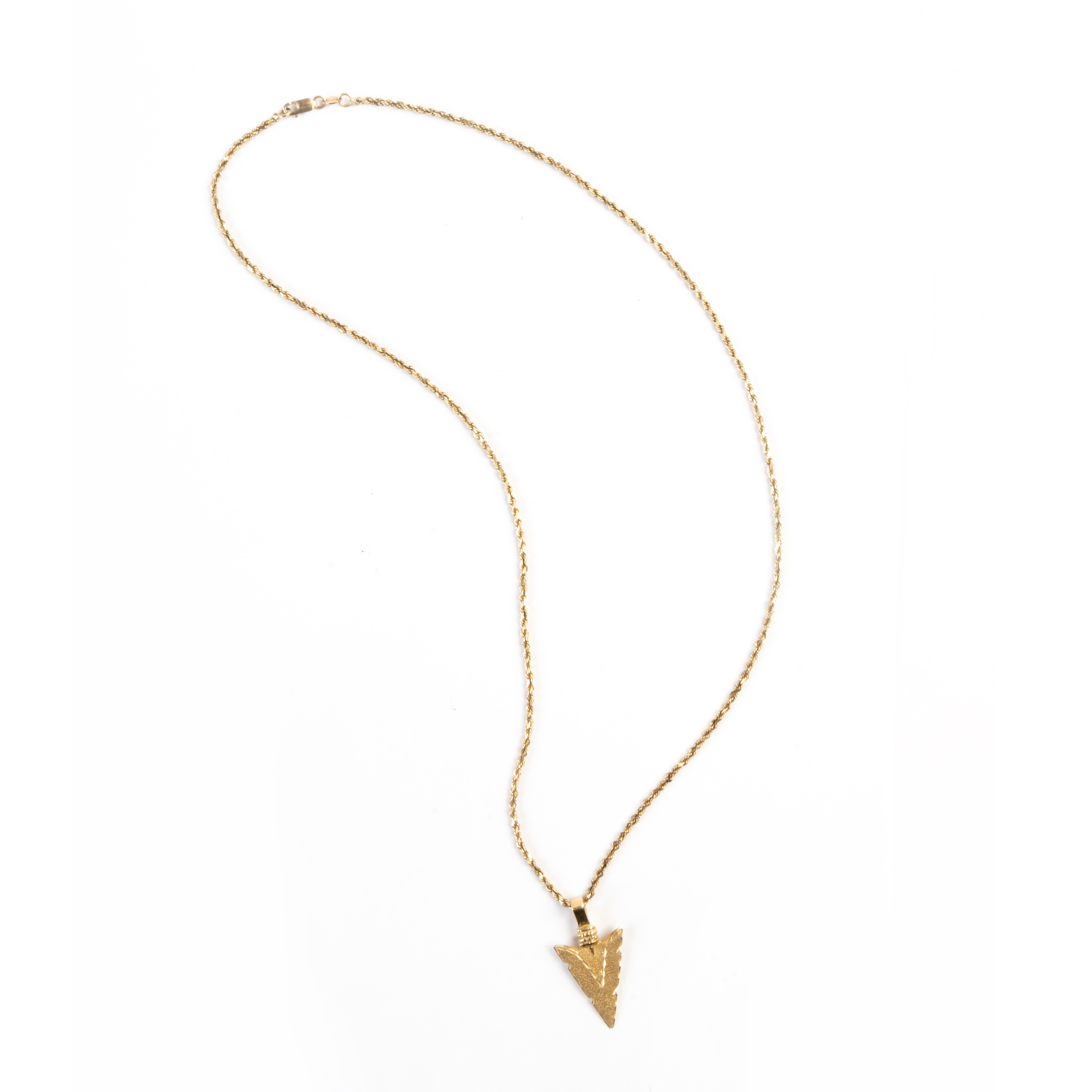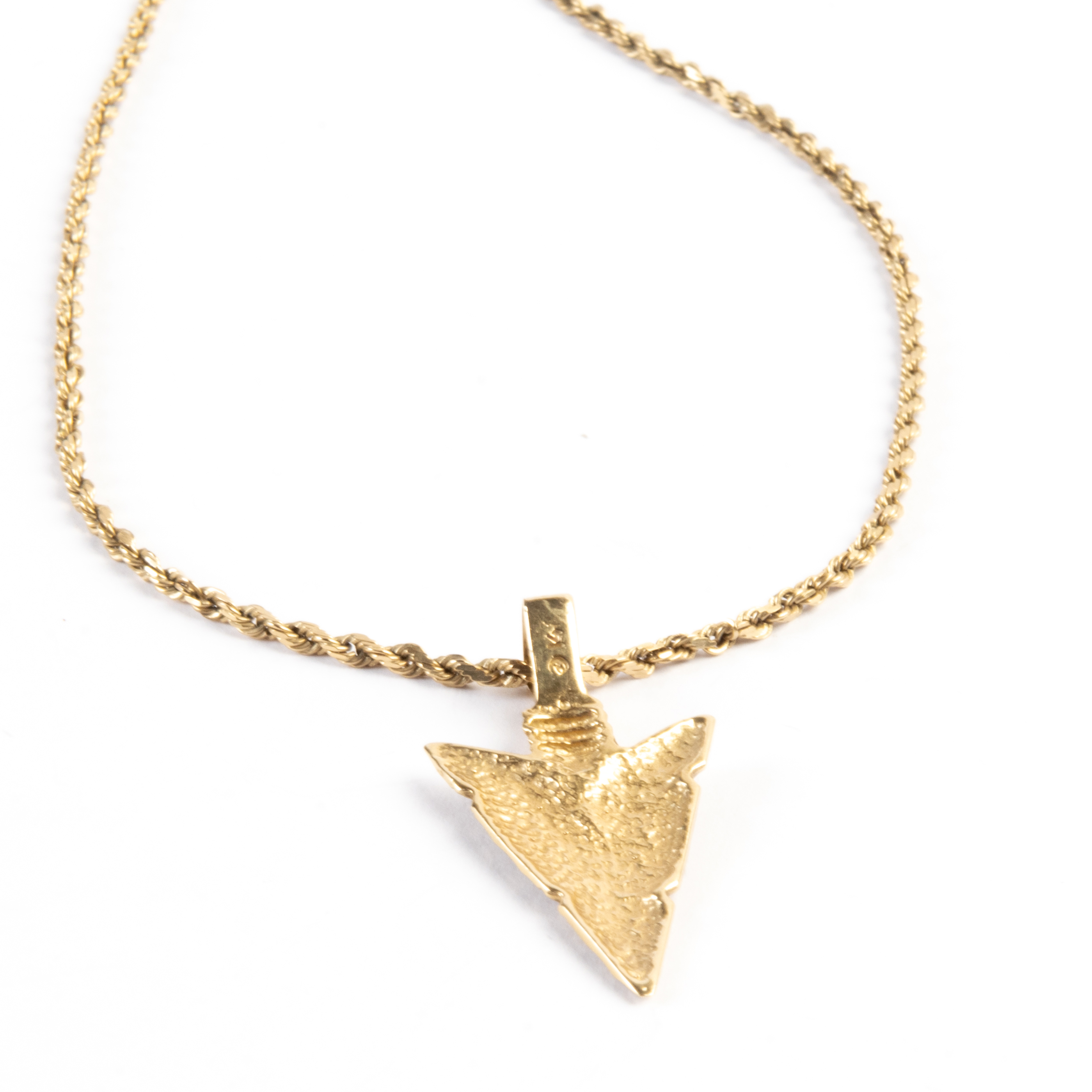 Featuring one 14k yellow gold arrow head pendant measuring approximately 33 x 17 mm, suspended from a 14k yellow gold rope link chain, forming a 20 inch necklace.