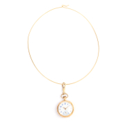 DIAL: Round, white, blue Arabic numeral hour markers, gold outer dot minutes track, subsidiary seconds dial at 6 oclock, gold Louis XIV style hands. MOVEMENT: Manual wind, jeweled. CASE: Round, 14k yellow gold, open face, 108426, 14k yellow gold cuvette no. 108426 and engraved Lillian C. Brown from Charles, engraved floral motif, 26 mm. Suspended from a 14k yellow gold 14 inch collar.