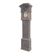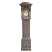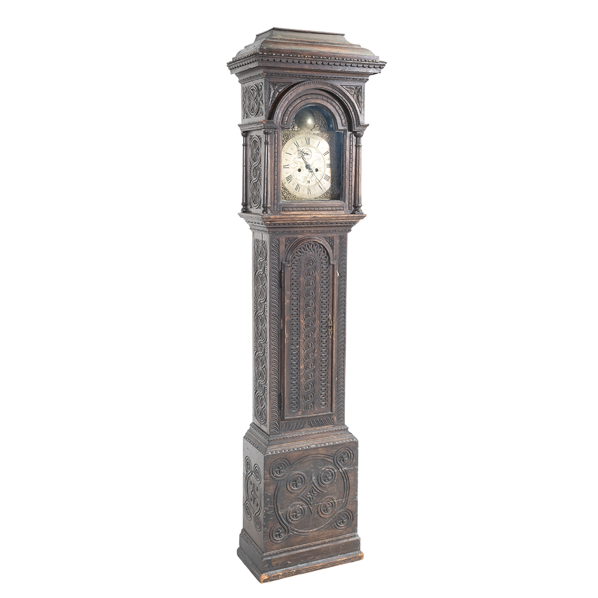 The ebonized case with relief carved decoration throughout, brass and gilt metal dial pendulum and two weights included.