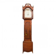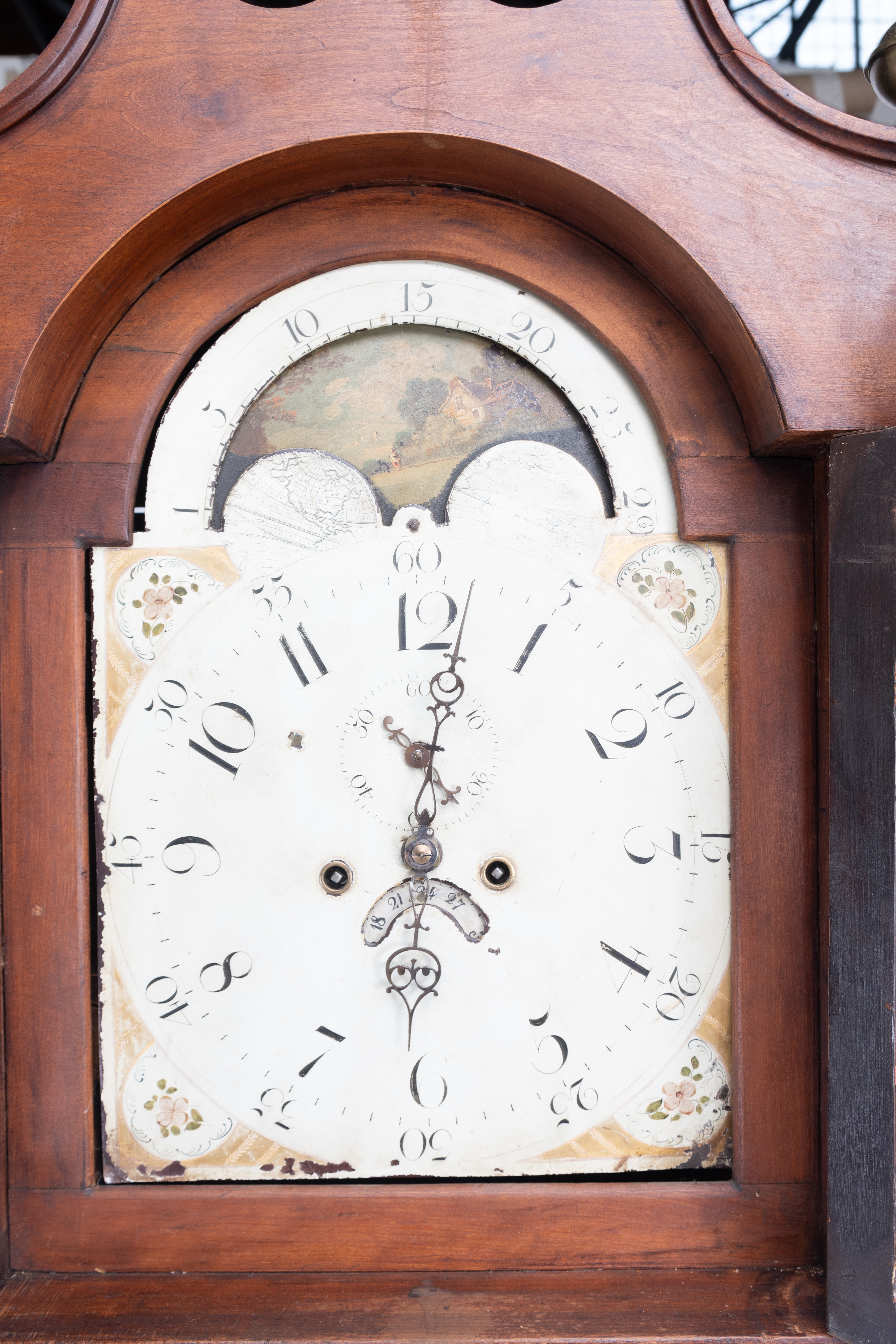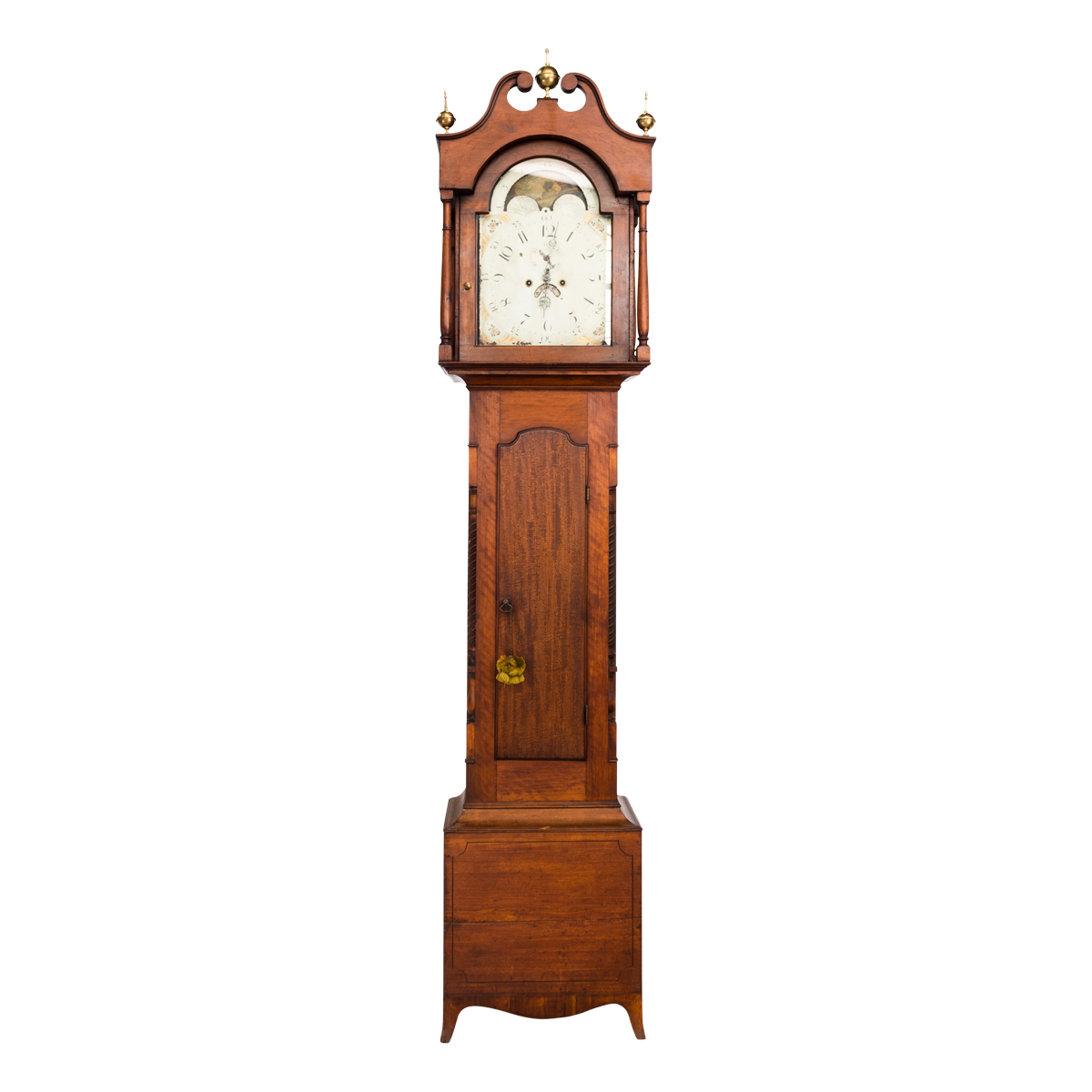 Hand-painted moon-phase dial, the hood with brass finials, two weights and pendulum included.
