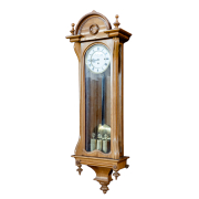 Walnut case with turned finials and applied roundels, arched crown white enamel dial with black roman numeral numbering and script three weights and pendulum included, lacking winder.