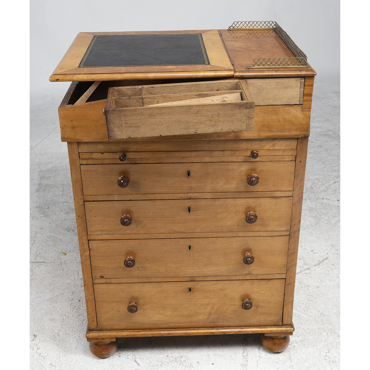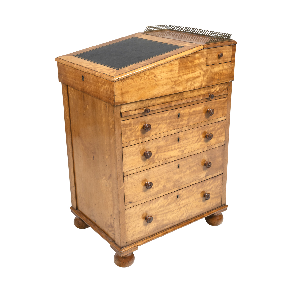 Condition: Minor surface wear throughout. Minor evidence of previous insect damage mainly towards the base. Apparent restoration to finish and some potential veneer repair. Leather top is likely later.
