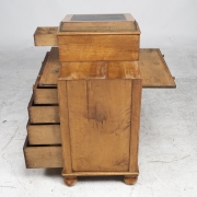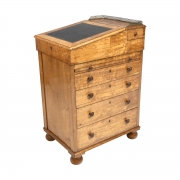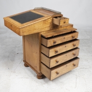 The slanted top with inset black leather writing surface, lifts to reveal cabinet space, pull out writing surfaces to both sides, four drawers to right side and additional small drawer bun feet.