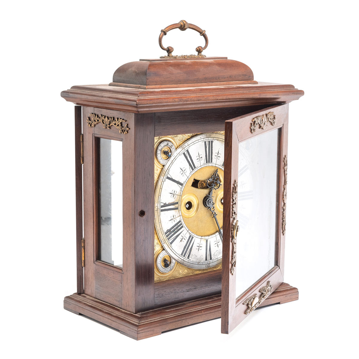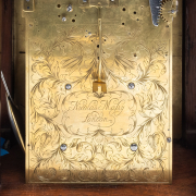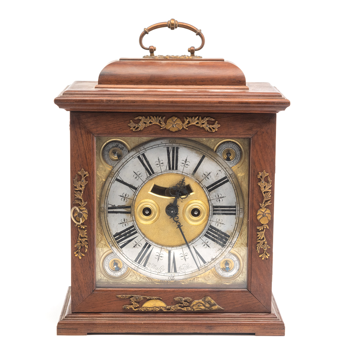 The mahogany case with gilt bronze chinoiserie mounts including clouds to the handle, dial within foliate engraved gilt metal surround, engraving continued to reverse pendulum included.