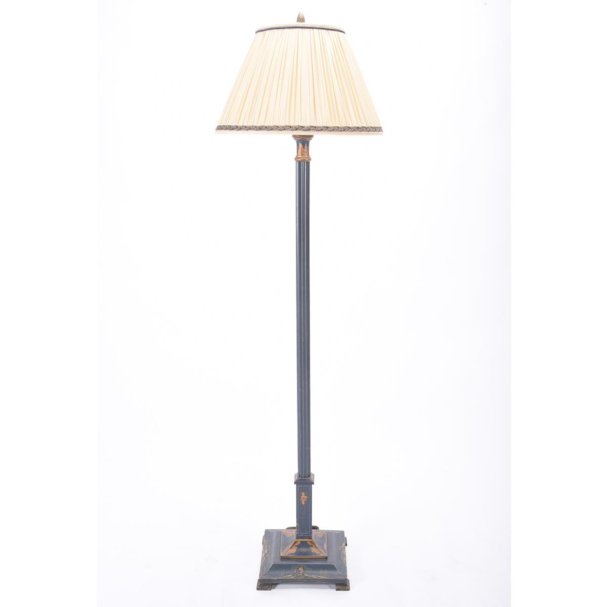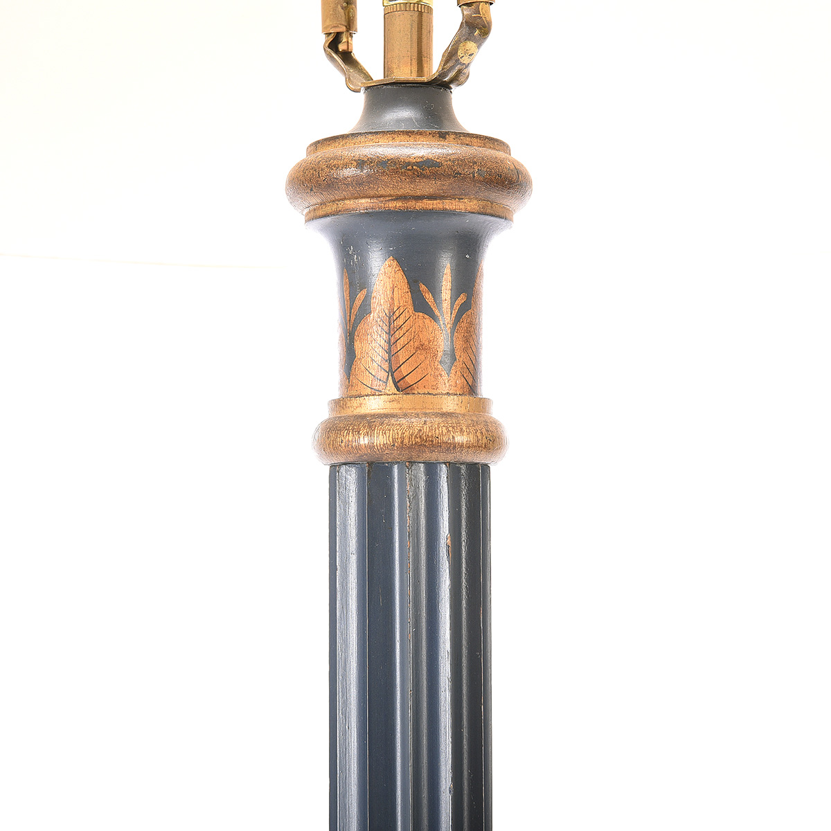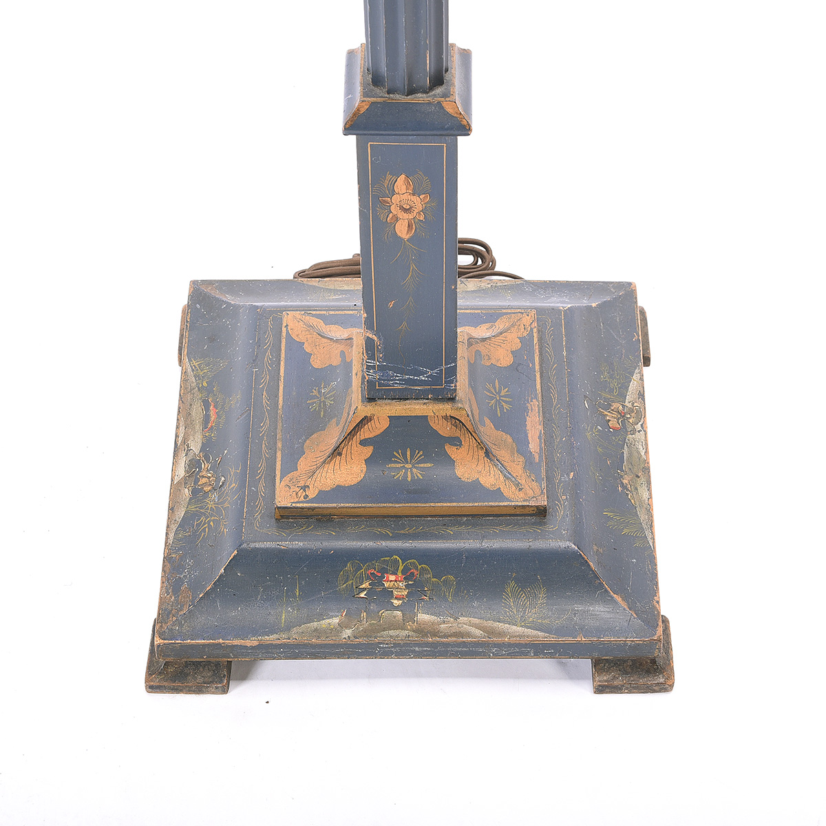 Fluted stem on a square wood base with four feet. Painted blue with parcel gilt, and figural scenes painted to the base.