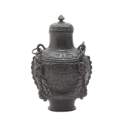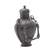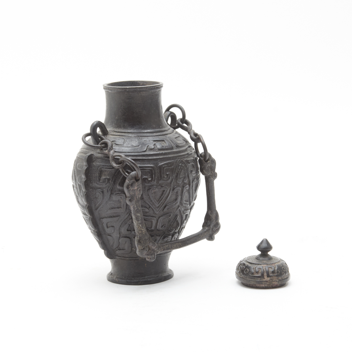 Of circular section with a tall foot supporting the globular body surrounded by recessed horizontal bands, the shoulder grasping circular rings attached by chains to Chilong handles, the body decorated with Lei and Taotie patterns, seal script inscriptions on the base.