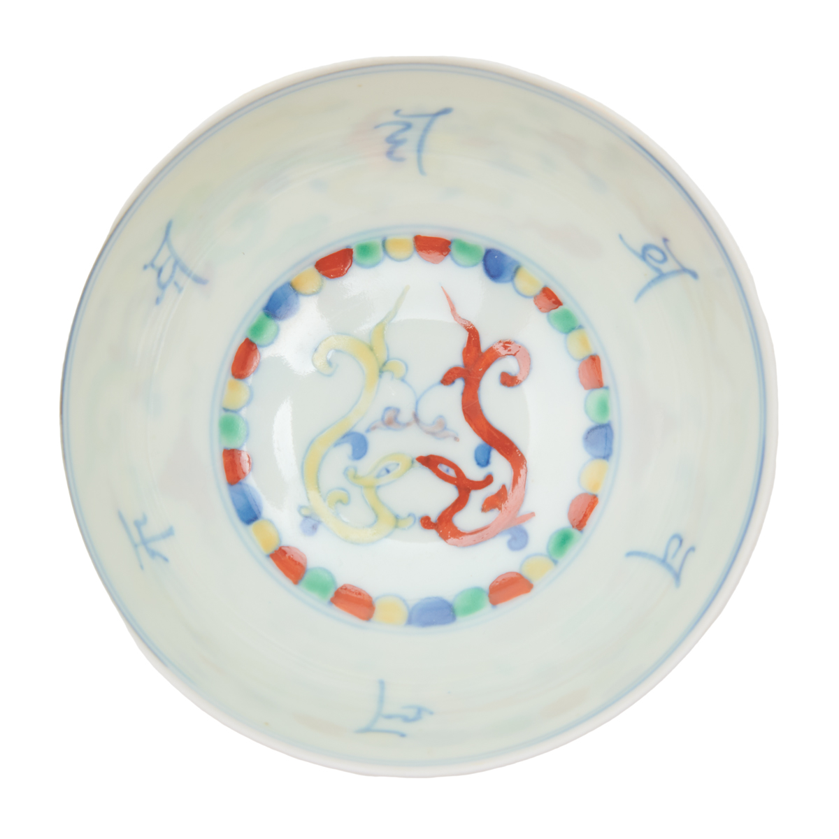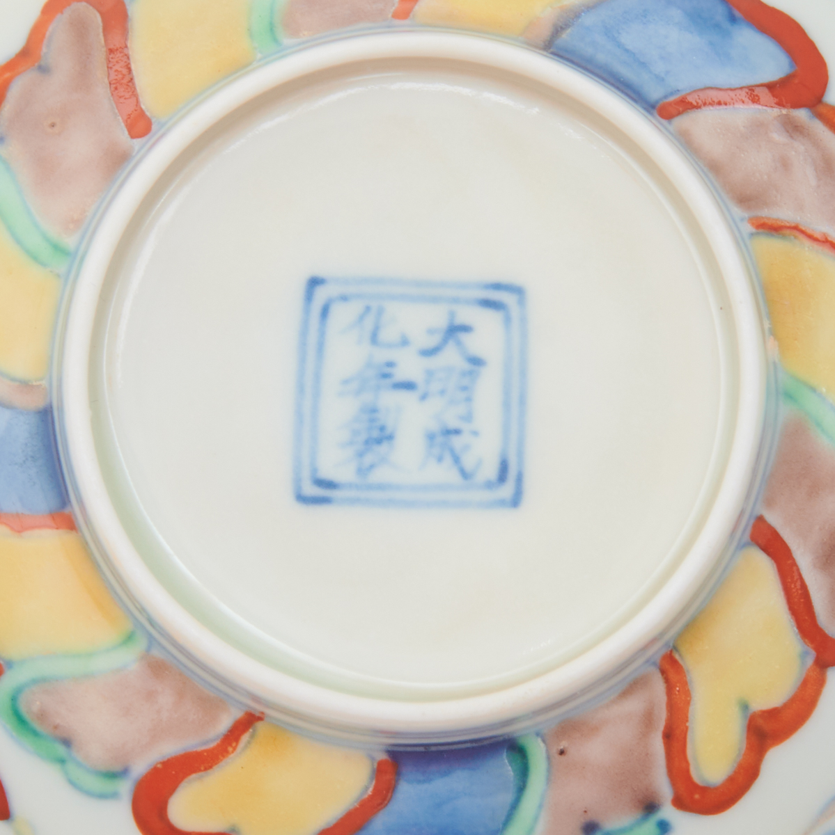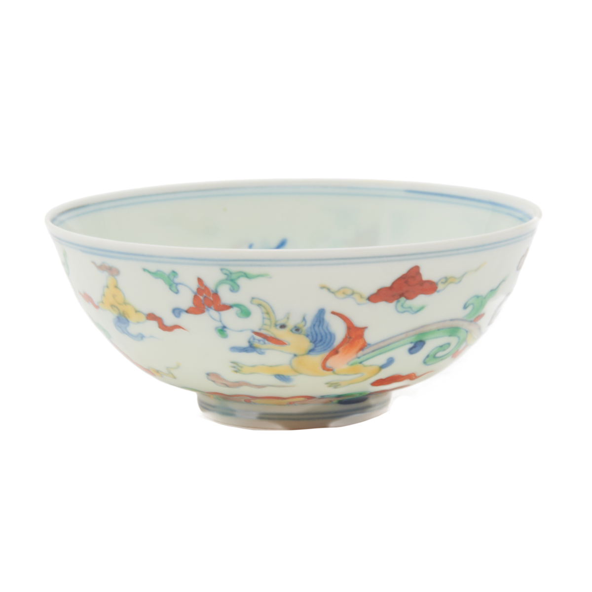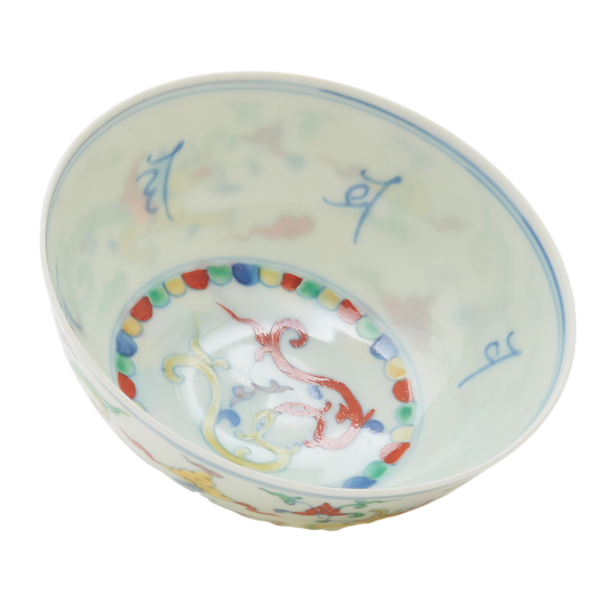 A small rounded body depicting two Chilong on the interior base and two yellow dragons flying amongst colorful clouds on the exterior surface, with a band of red, blue, and yellow bamboo encircling the foot, the interior decorated in swirl formations resembling a face surrounded by bamboo and characters, Chenghua six-character mark.