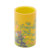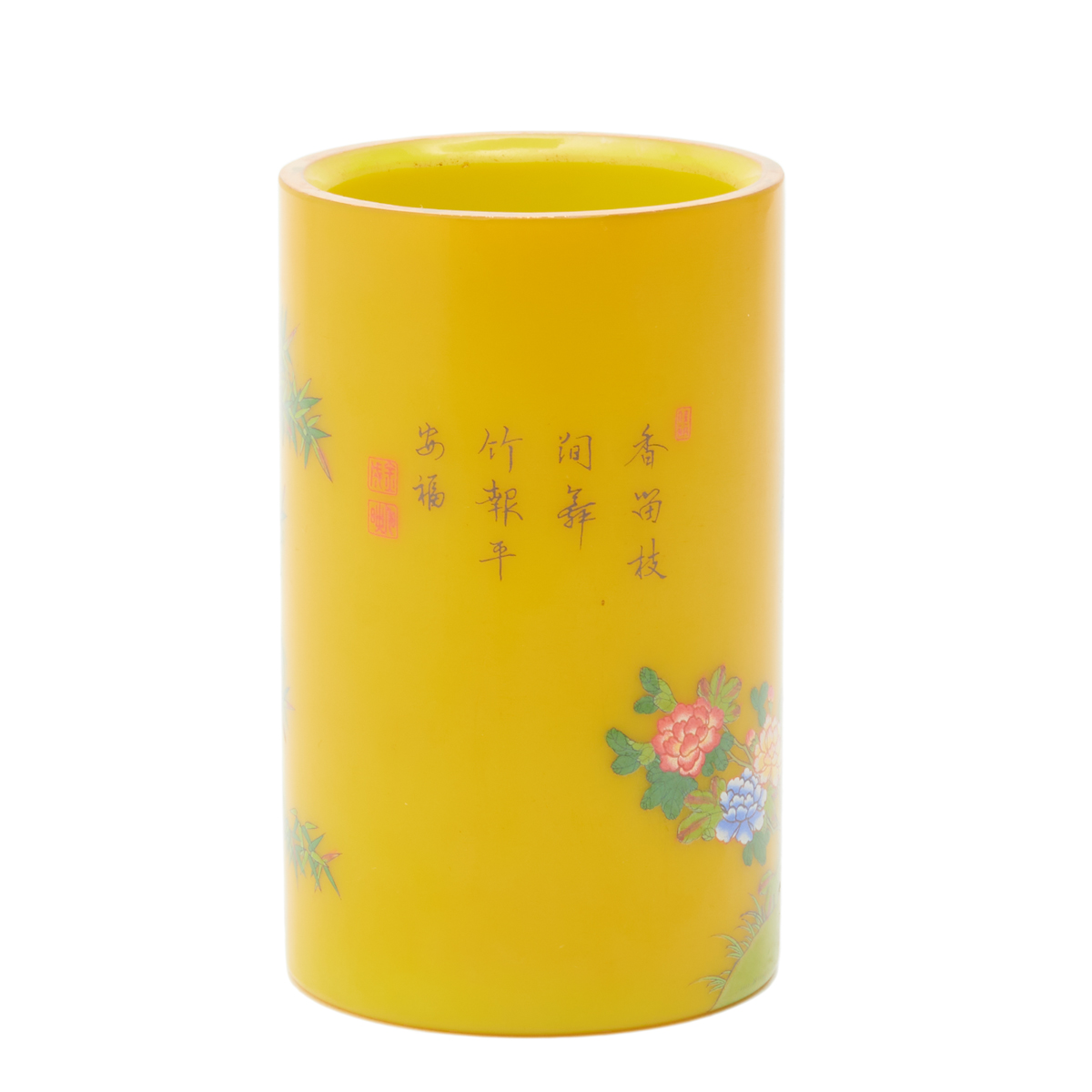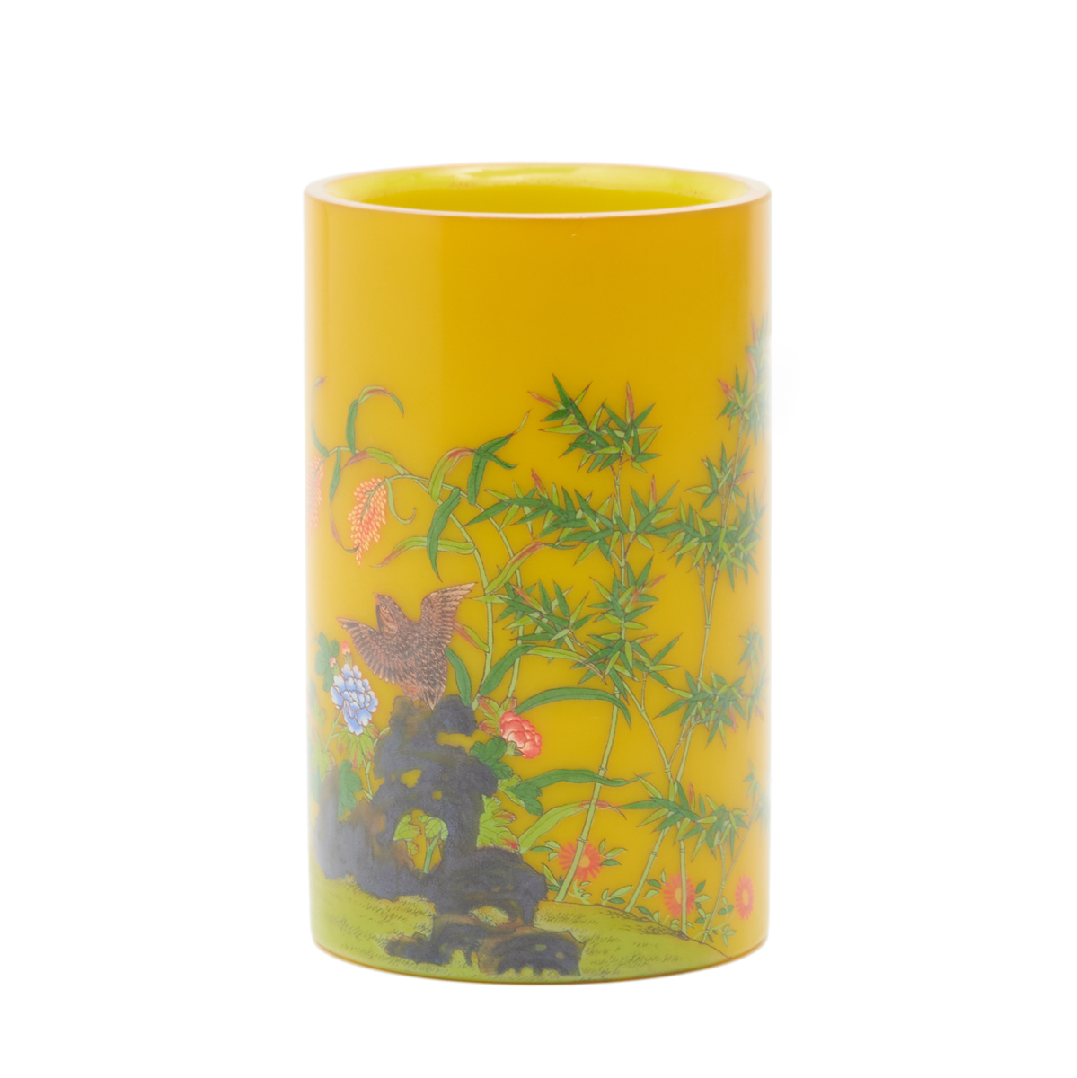 Of cylindrical form rising to a gilt mouth, the body decorated with cloisonn enamels depicting birds, peonies, scholars rock, and bamboo, Yongzheng yuzhi mark.
