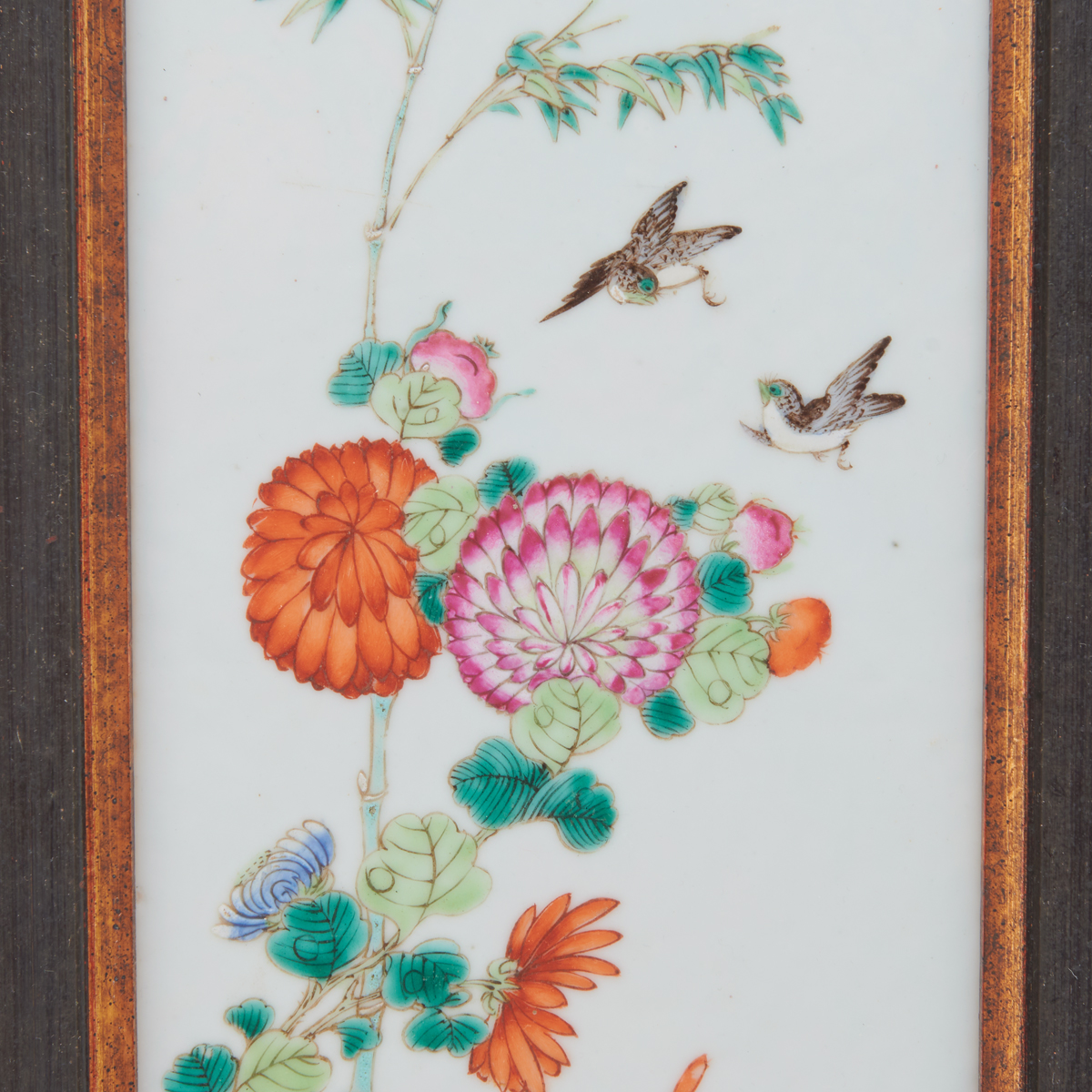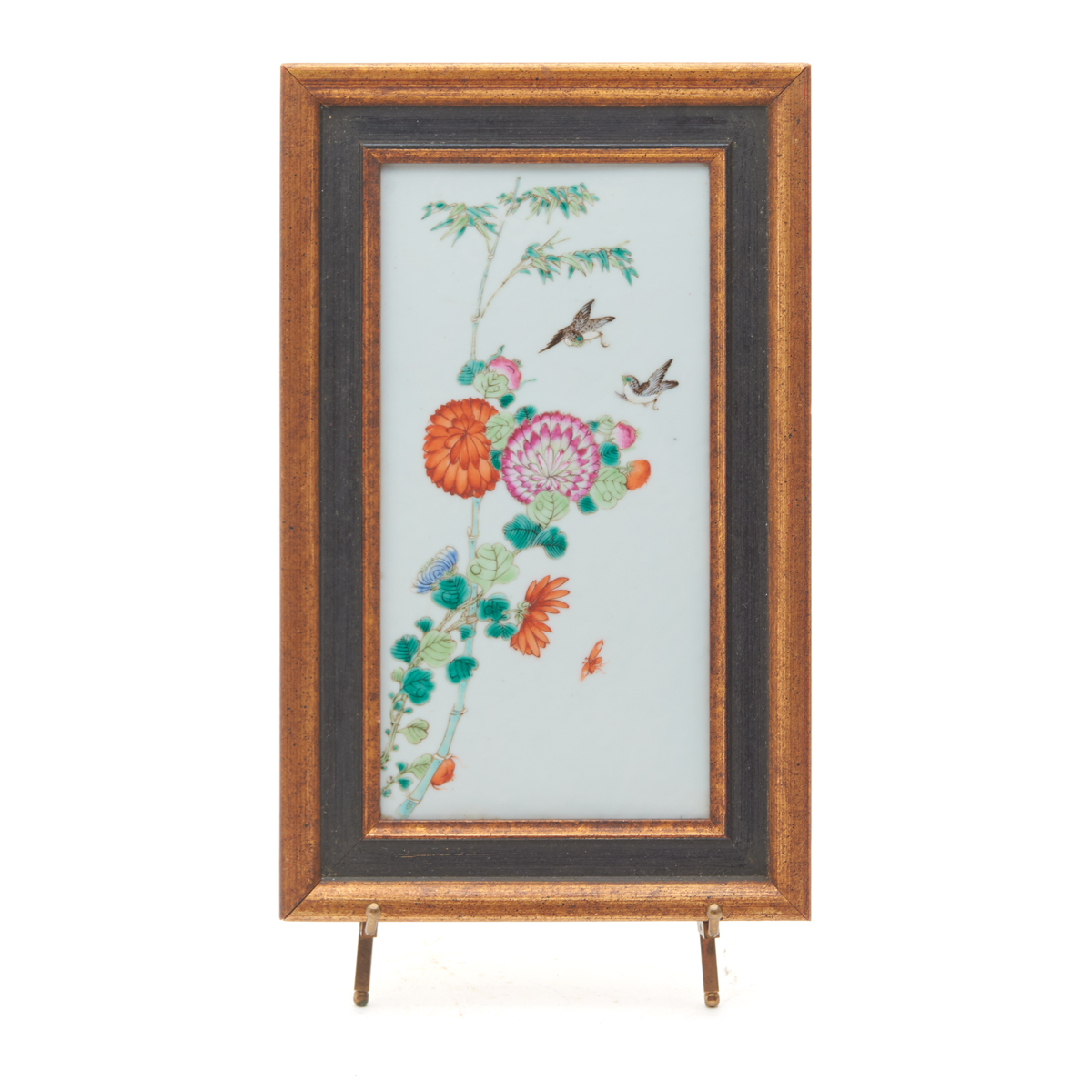 A framed porcelain plaque decorated with tall blooming flowers, two flying birds and an orange butterfly, including a stand.