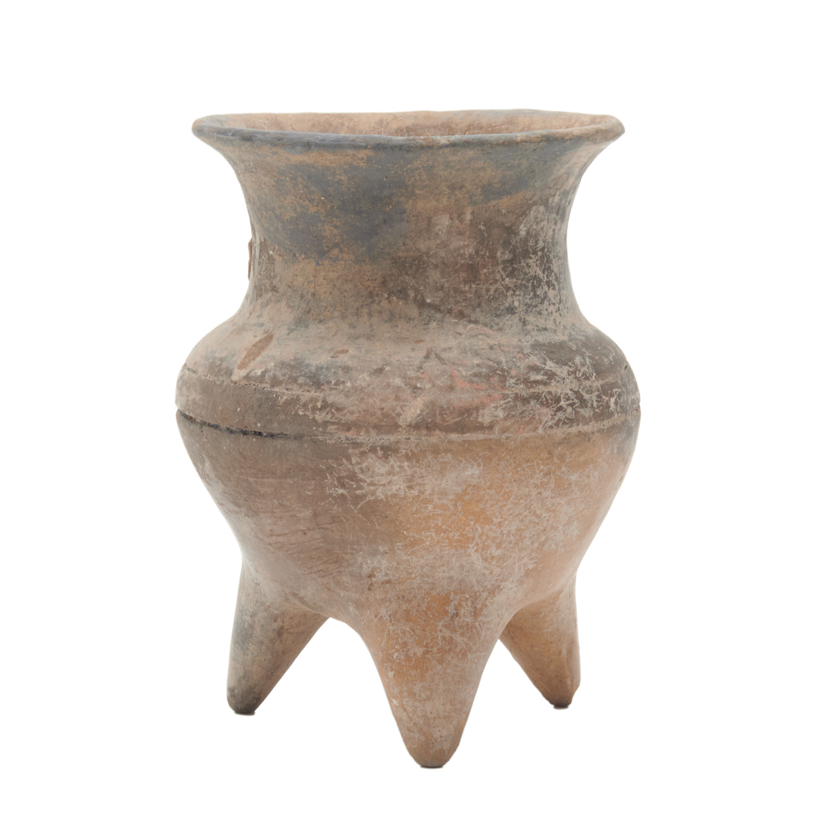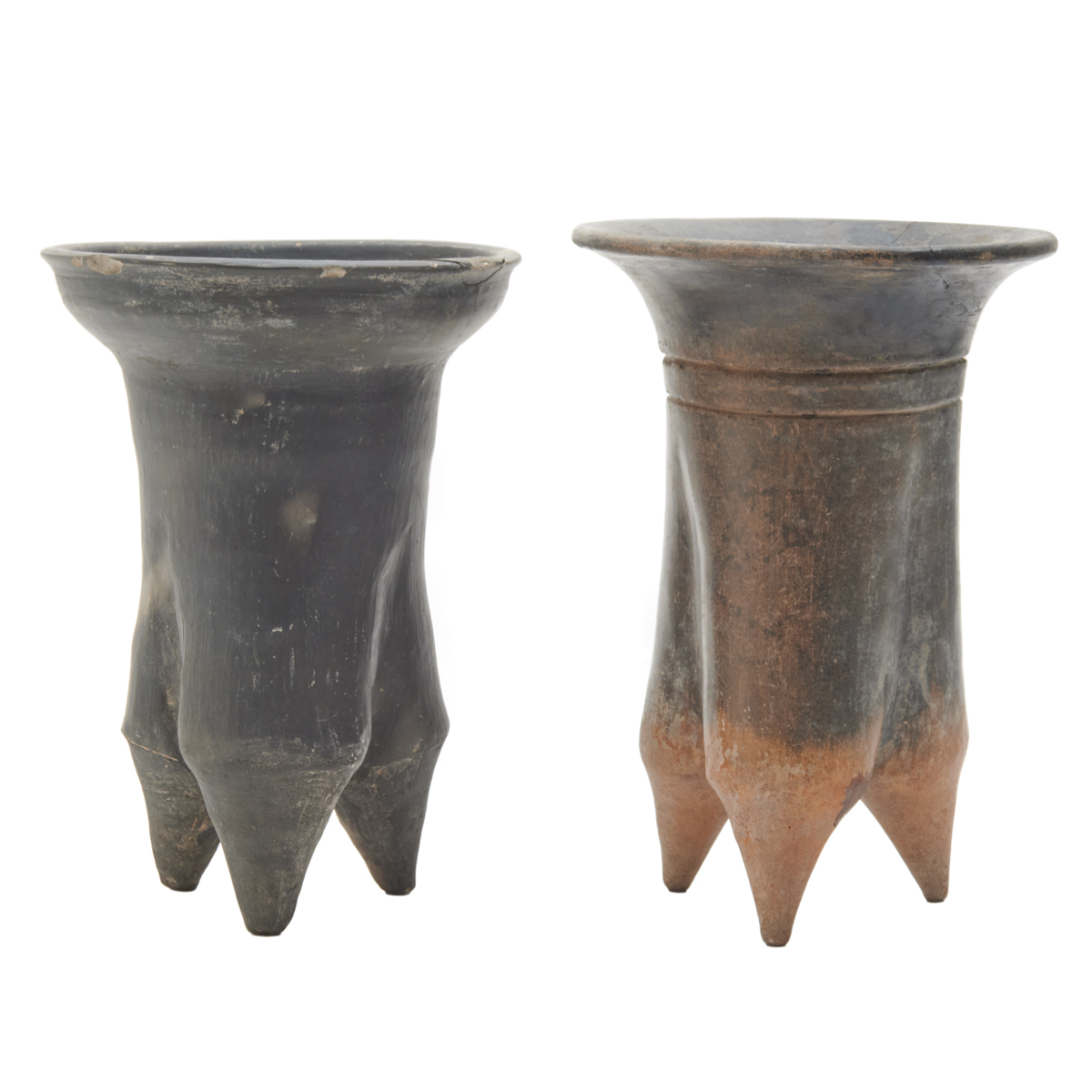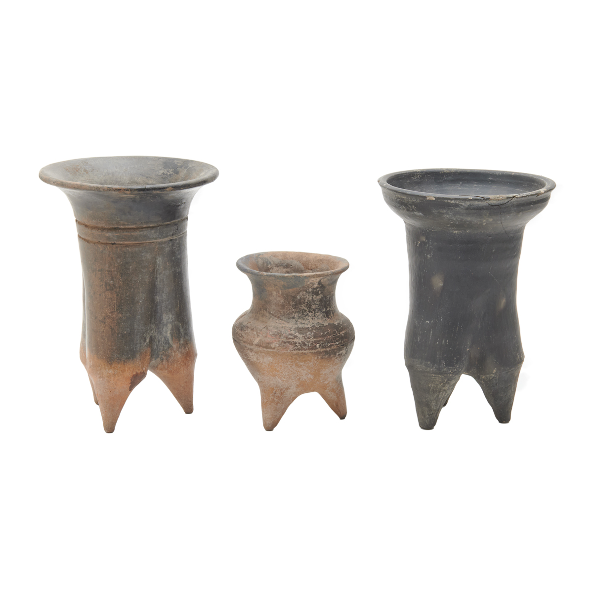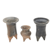 Comprising: a tall body with an everted and flared rim and a double lined band encircling the shoulder a tall thick body with a wide flaring mouth a small stout vessel with a double lined band wrapped around the waist all vessels stand on three inverted triangular feet leading to an apex point.