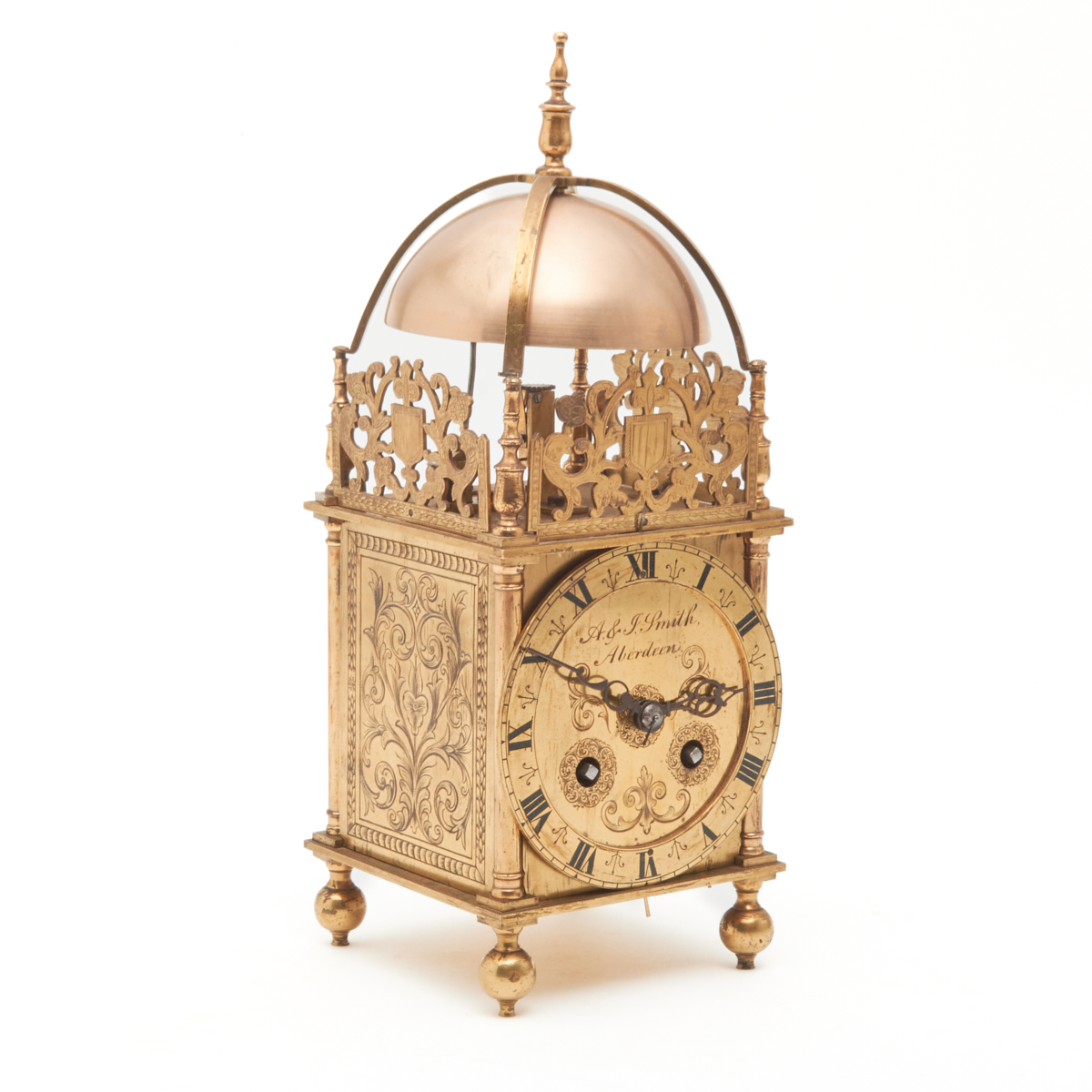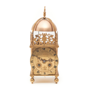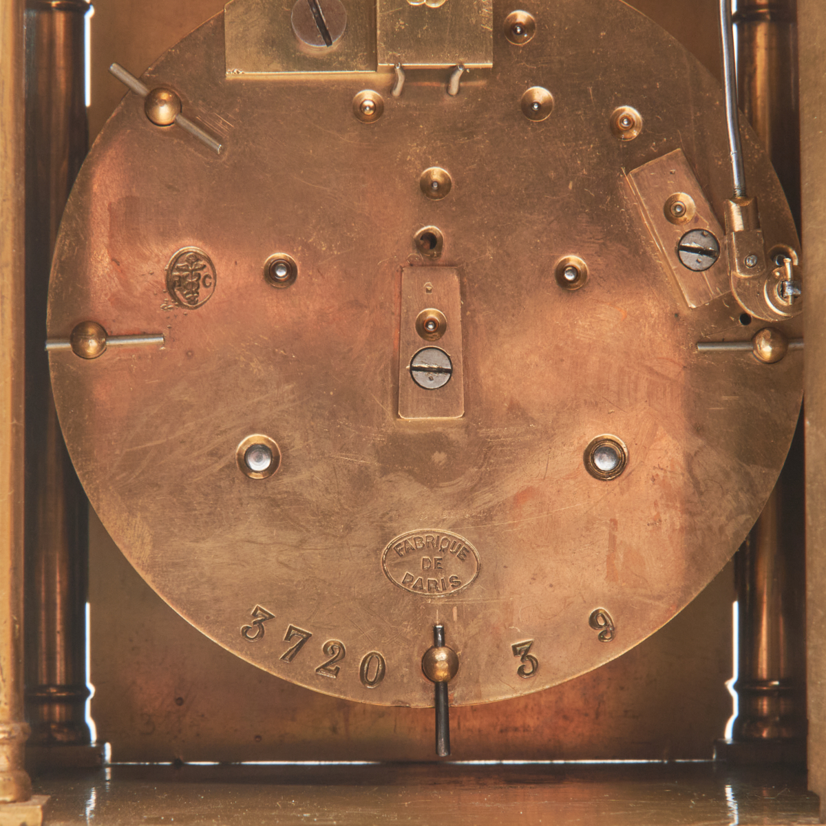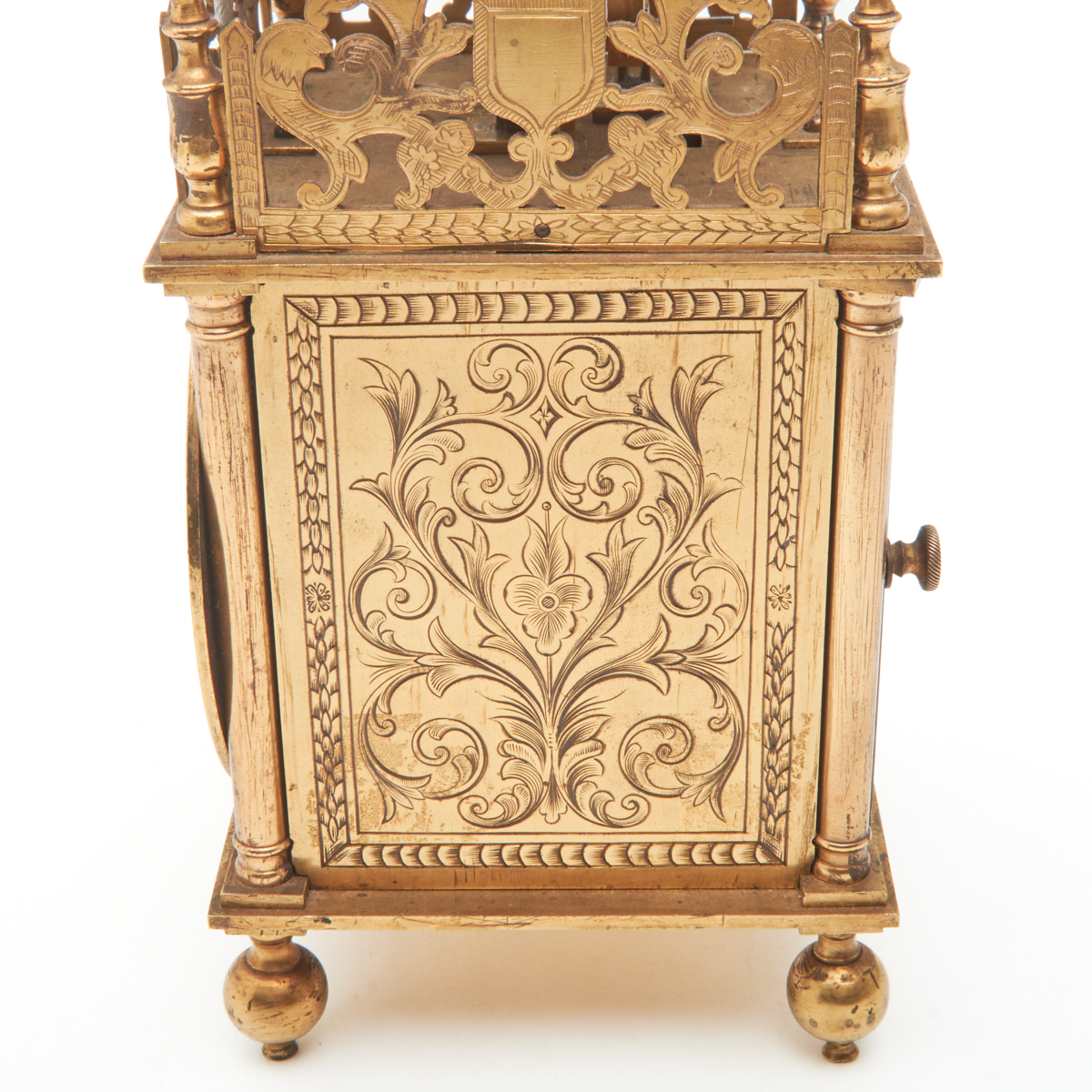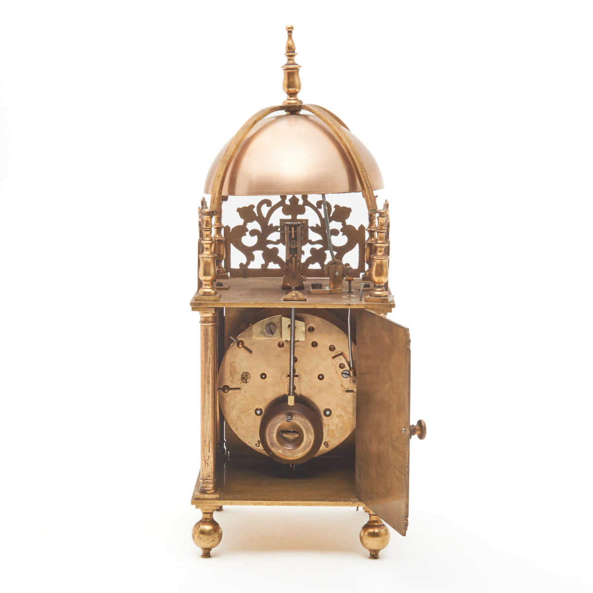 Condition: Has not been tested, working order is not guaranteed. Domed bell support with loss, does not rest properly on the top of the clock. Patina to brass throughout with minor surface wear.