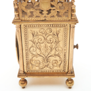 Domed bell to top with surrounding engraved gallery, the body of the clock with scrolled foliate engraving, raised on pointed ball feet engraved dial with black roman numerals pendulum included.