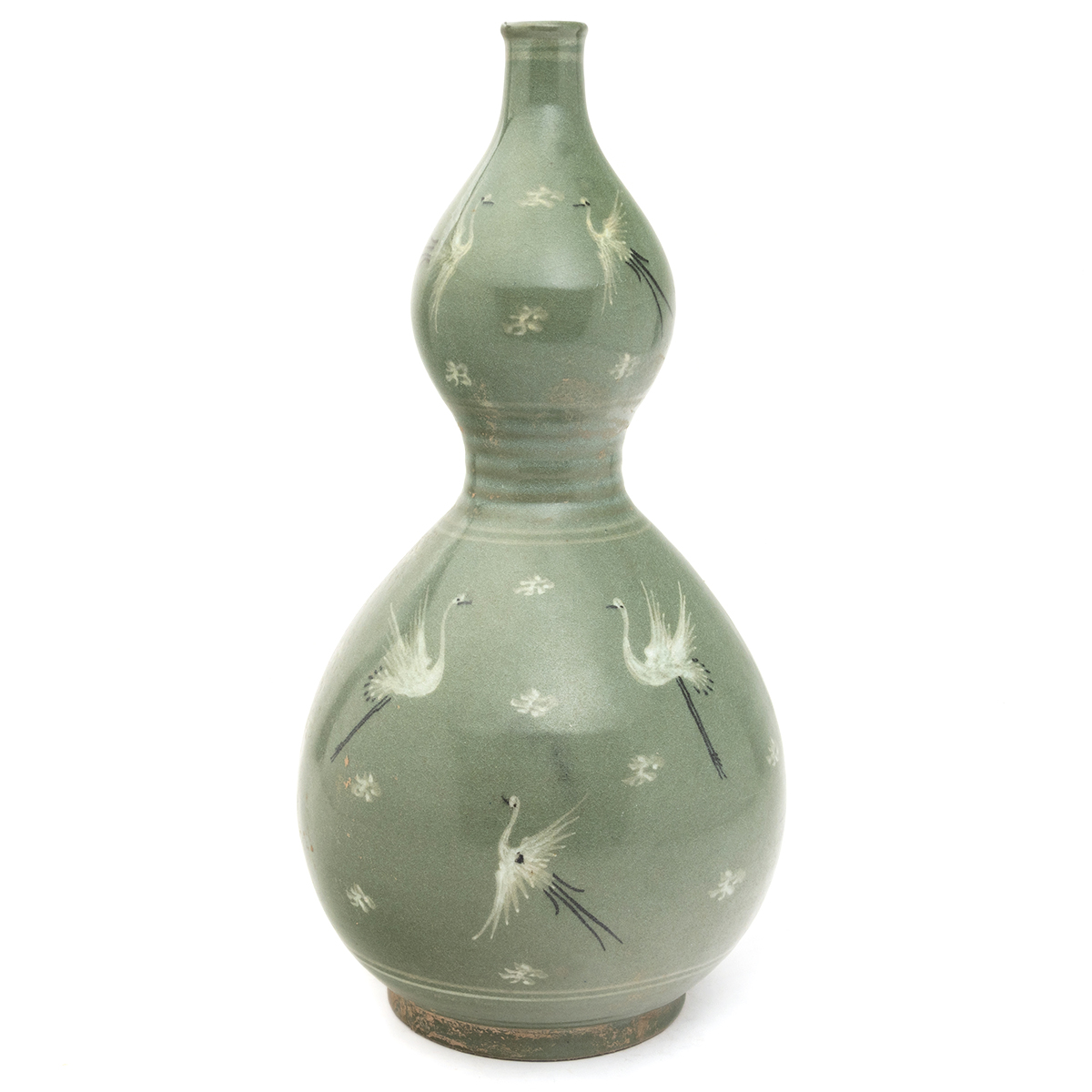 Well potted with a lower bulb of globular form, surmounted by a pear-shaped upper bulb above the ribbed waist. It is evenly coated with a pale celadon-green glaze with fine crackles and decorated with flying cranes against clouds.