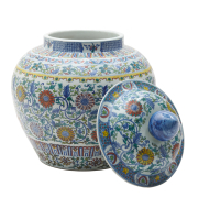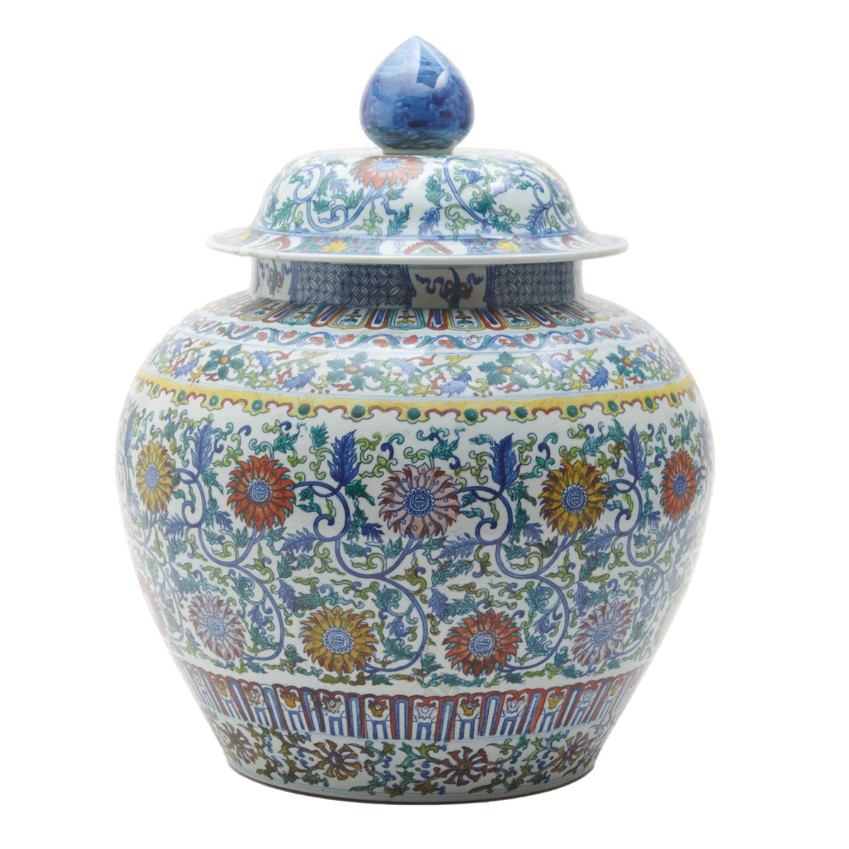Robustly potted rising from a waisted lower body to a generous shoulder and upright neck, polychrome enamels depicting scrolling foliage and flowers set against a white ground, a lappet band at the shoulder, the cover finished with similar designs, a almond shaped finial on the dome cover painted with blue enamel, the recessed base bearing a Qianlong six-character mark.