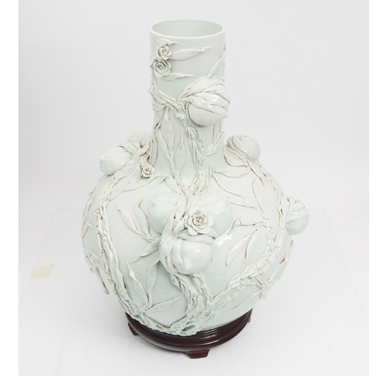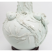 Heavily potted with a large globular body surmounted by a cylindrical neck, the exterior molded with gnarled branches bearing nine peaches and small blossoms.