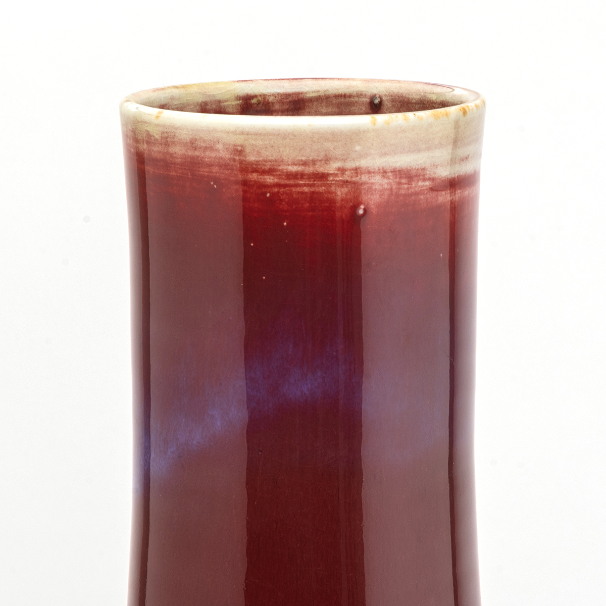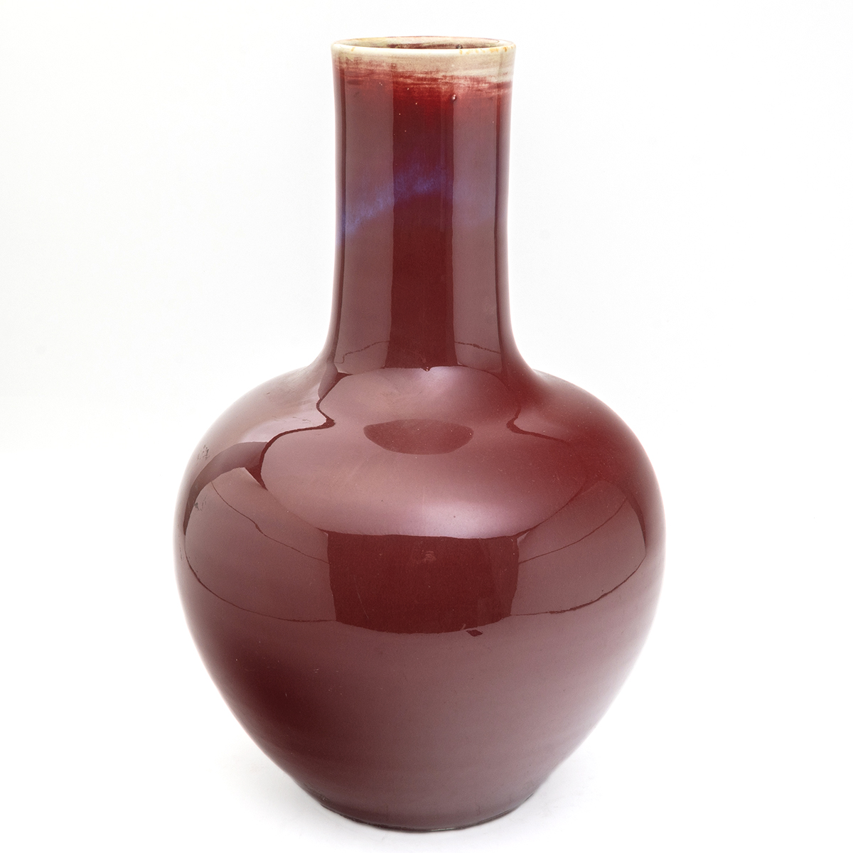 Heavily potted, featuring a globular body with a tall cylindrical neck covered in a deep red glaze with traces of a purplish touch, which fades to a white glaze below the rim, an engraved four-character Yongzheng reign mark on the bottom.
