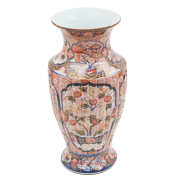 Covered in a red floral design with gilt embellishments.