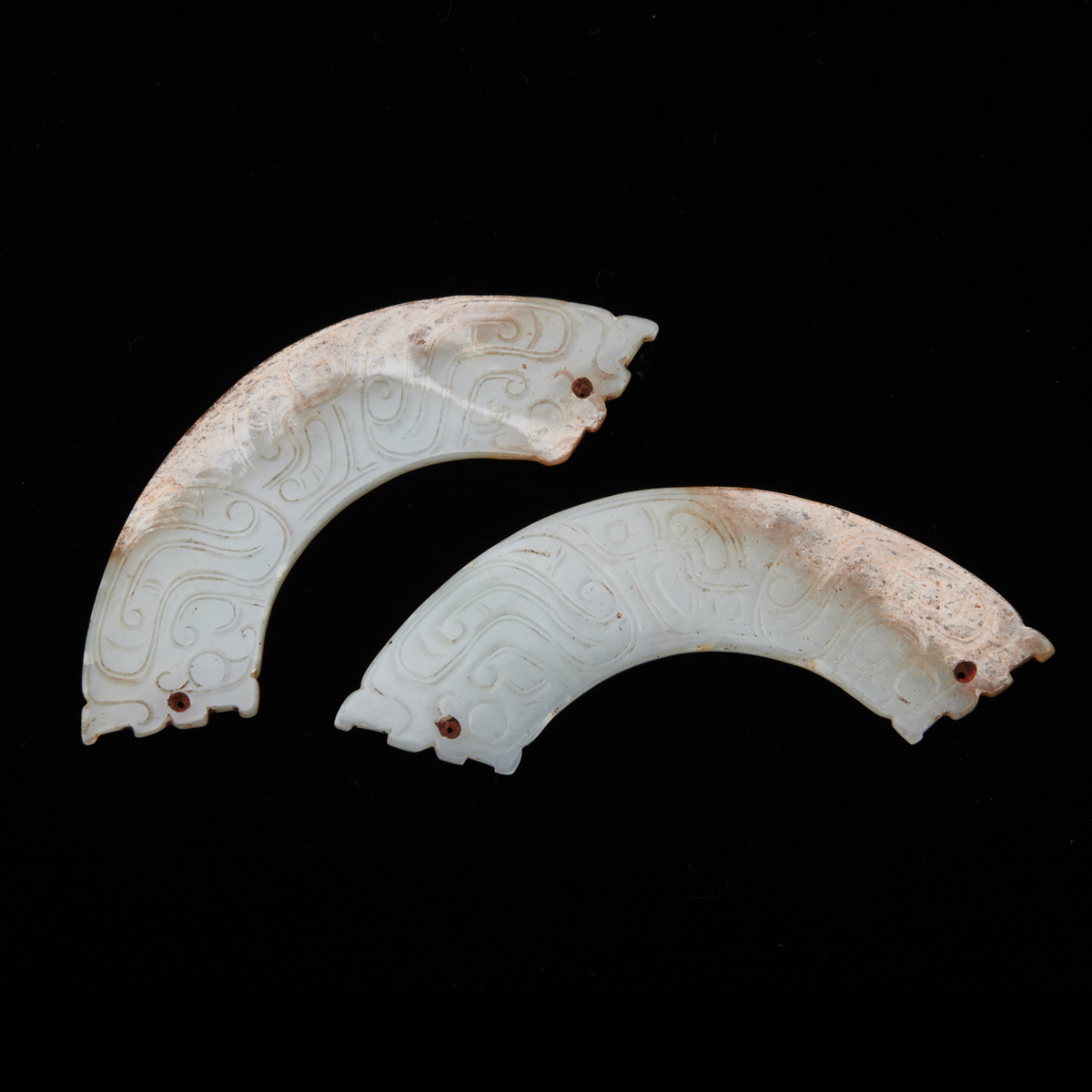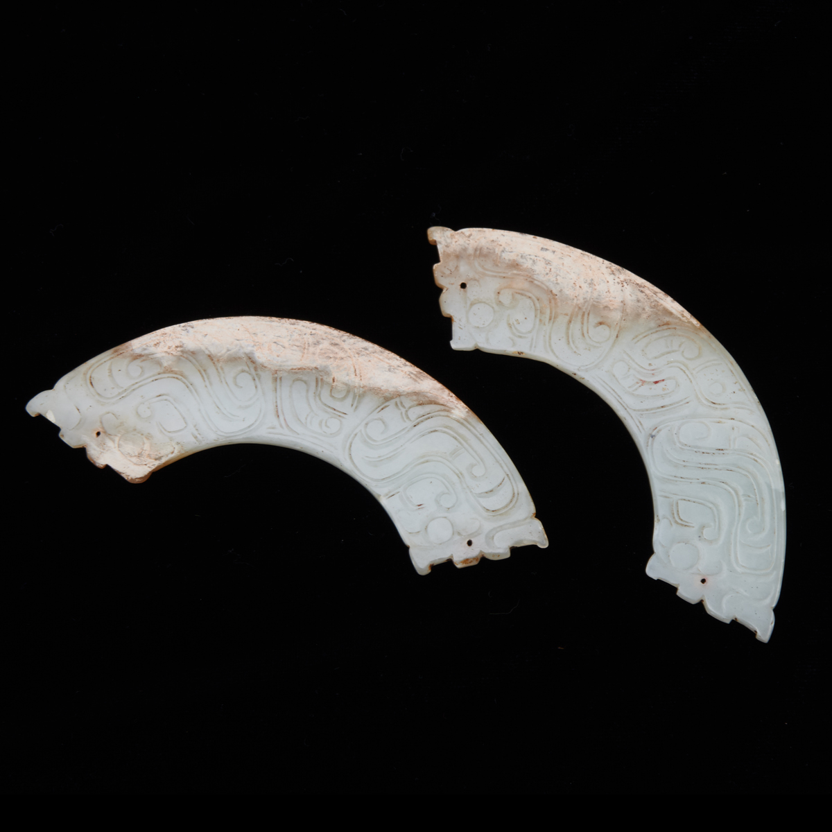 Each of flat arched shape with both sides decorated with incised Taotie patterns, drilled with a small aperture at the top of the arch for suspension.