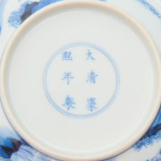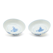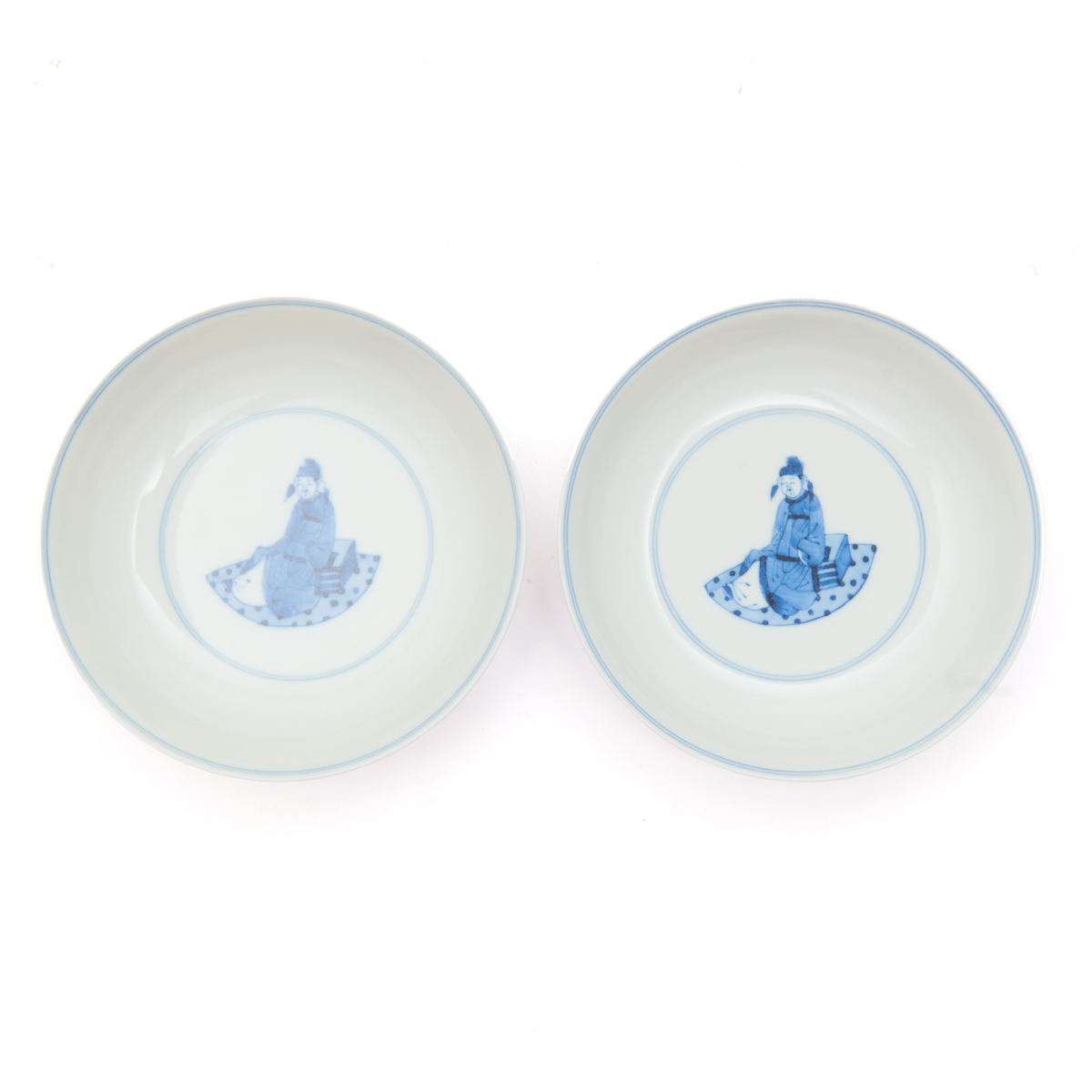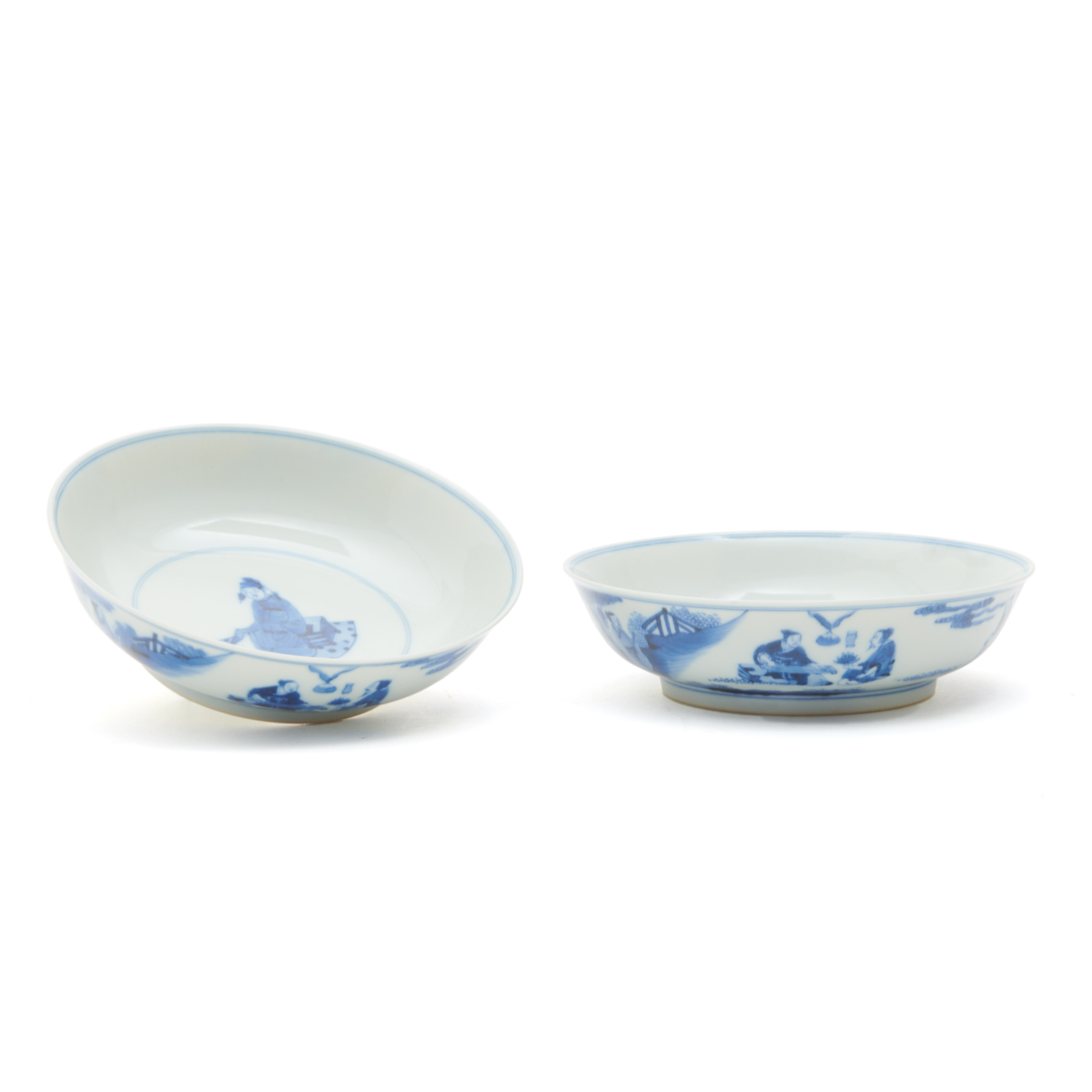 Each finely potted with gently curved sides, the inside depicting a male deity in meditation, the exterior decorated with a narrative scene of various figures in a garden, the base bearing Kangxi six-character mark.