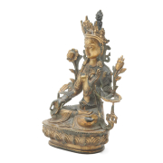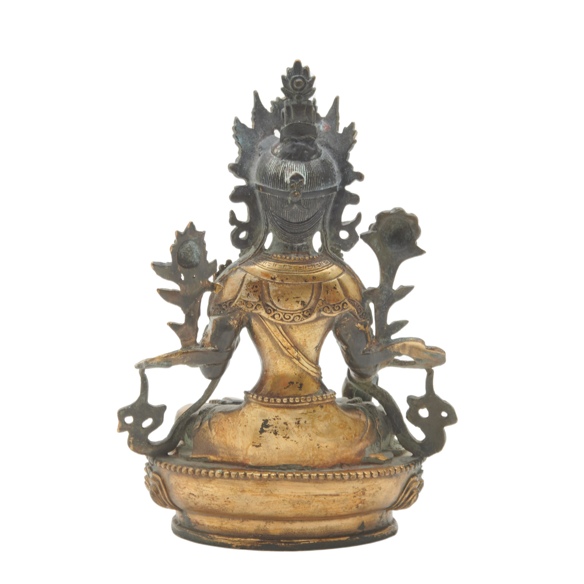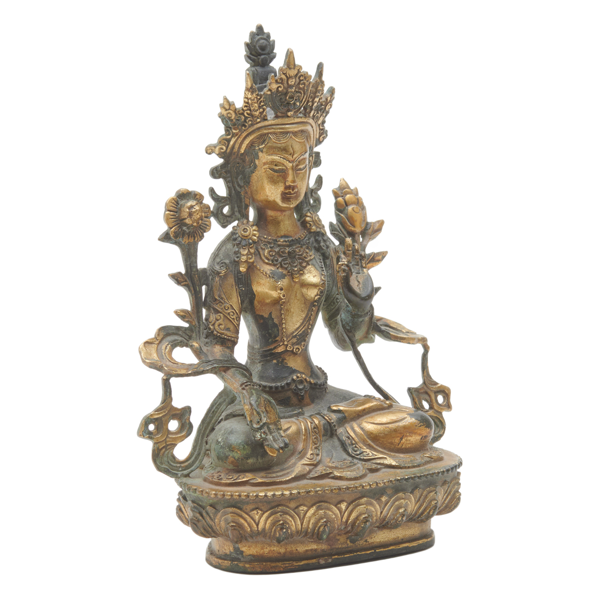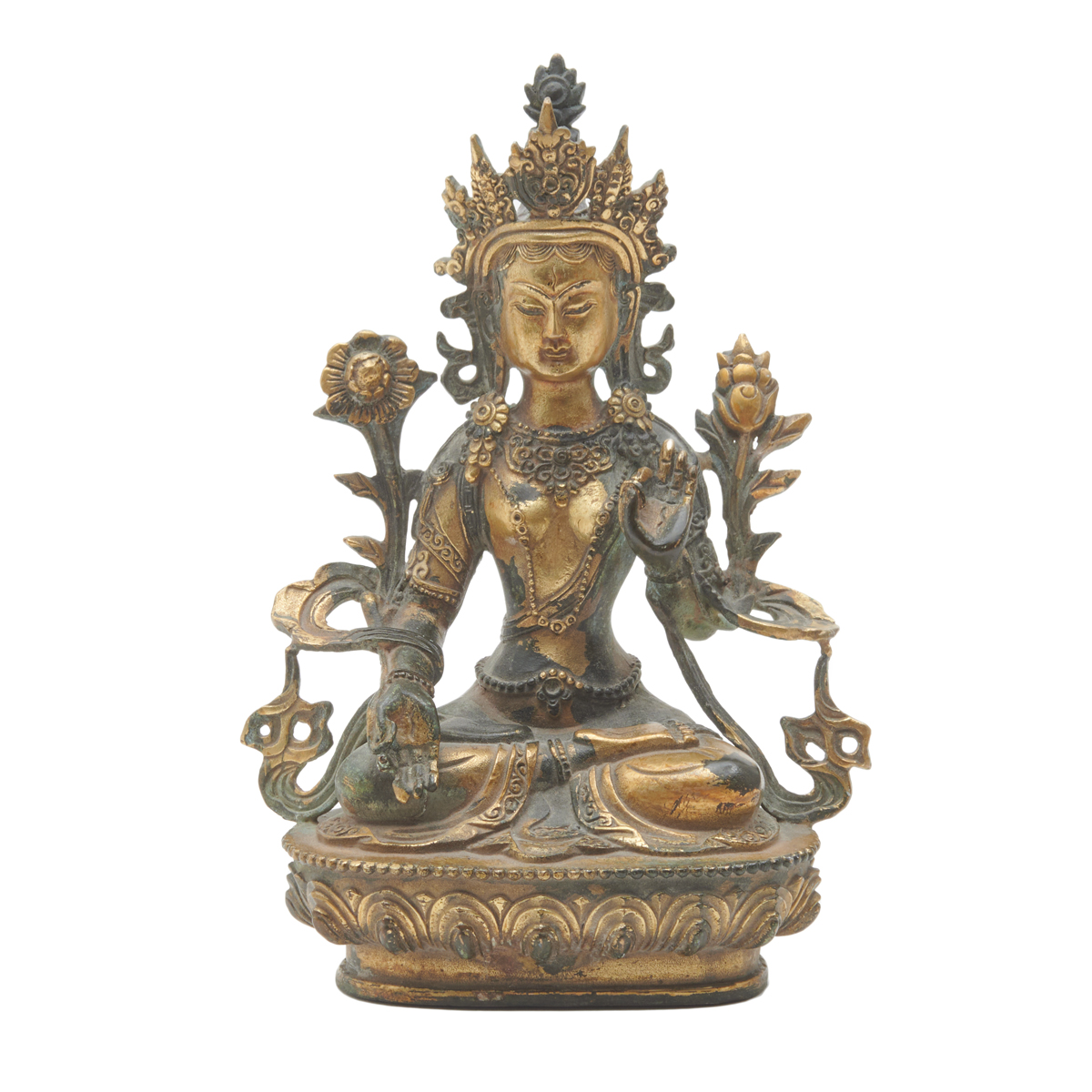 Cast gently swaying and seated in dhyanasana with two legs crossed on a lotus base with a beaded edge, depicted with the hands held in varada and sharanagamana mudra, the face with a benevolent expression accentuated with downcast eyes beneath arched brows and a gentle smile, framed by a pair of pendulous earlobes adorned with ornate wheel-shaped earrings and an elaborate tiara enclosing a high chignon, further clad in ornamental jewelry and entwined with long multi-stemmed lotus flanking the shoulders.