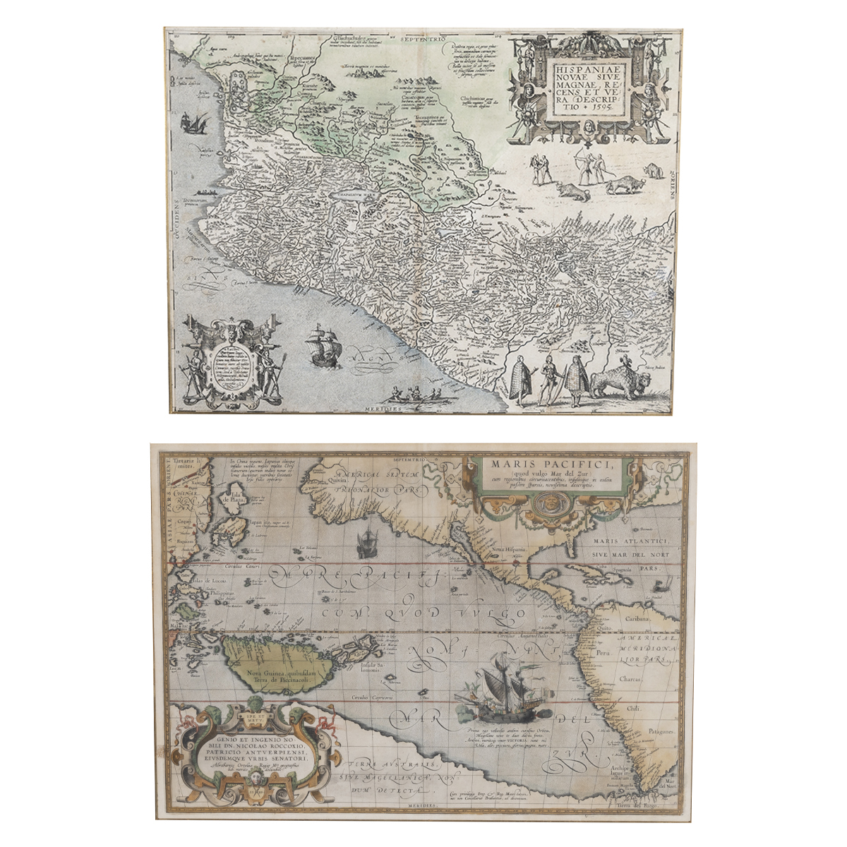Maris Pacifici quod vulgo Mar del Zud, 1601, and Hispaniae Novae Sive Magnae, Recens et Vera Descriptio, 1595,