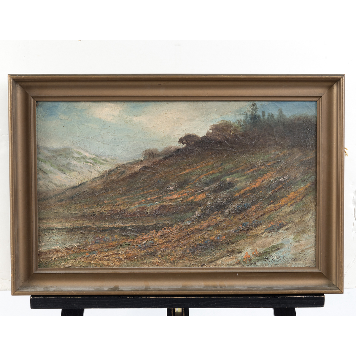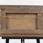 Condition: Surface dust, discoloration, varnish aging, and craquelure throughout canvas. Minor frame abrasion. Dirt pockets and moderate embrittlement to canvas verso.