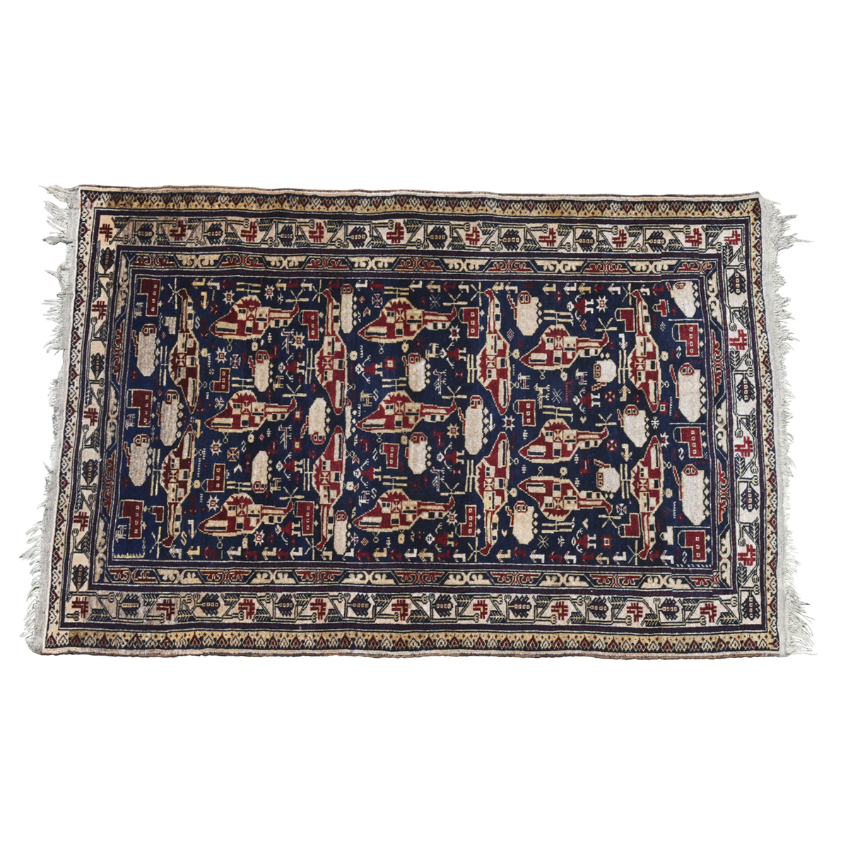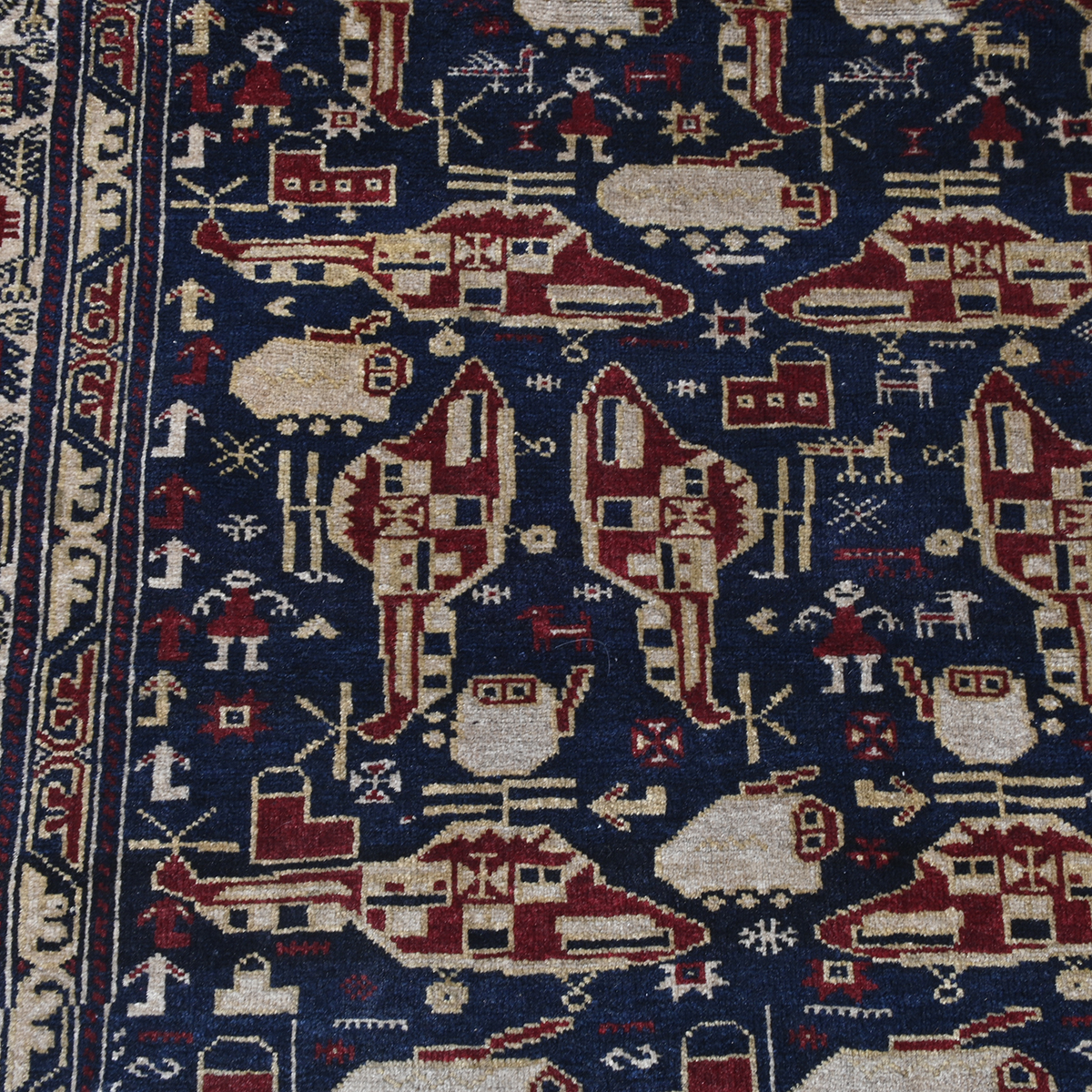 Woven with tanks, helicopters, transporters, bombs, and people on a dark blue ground.