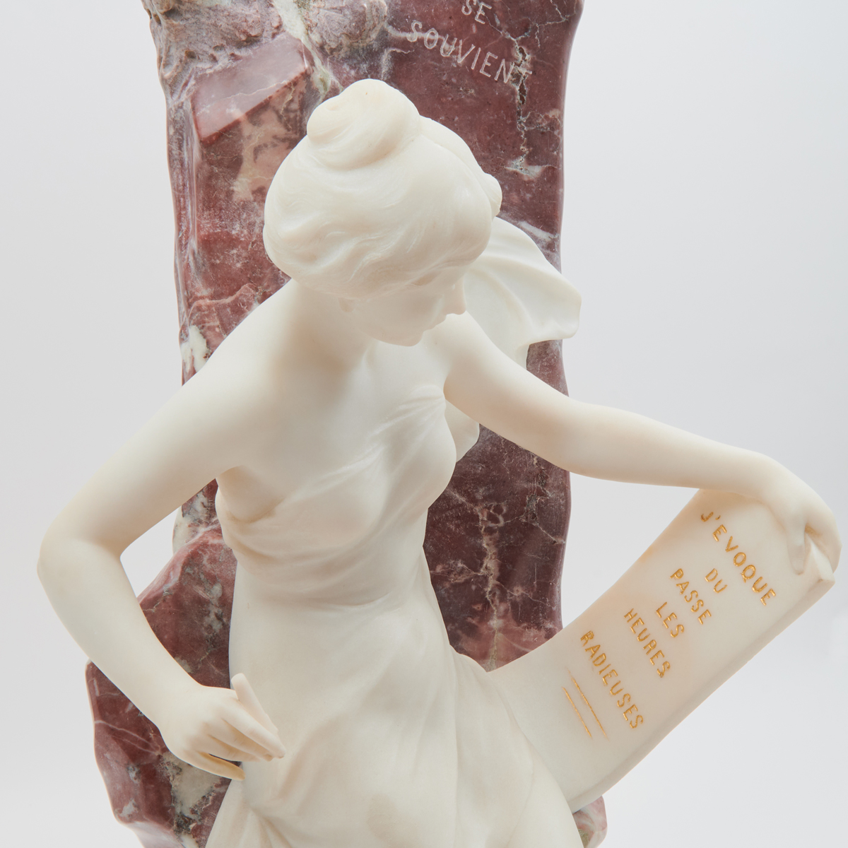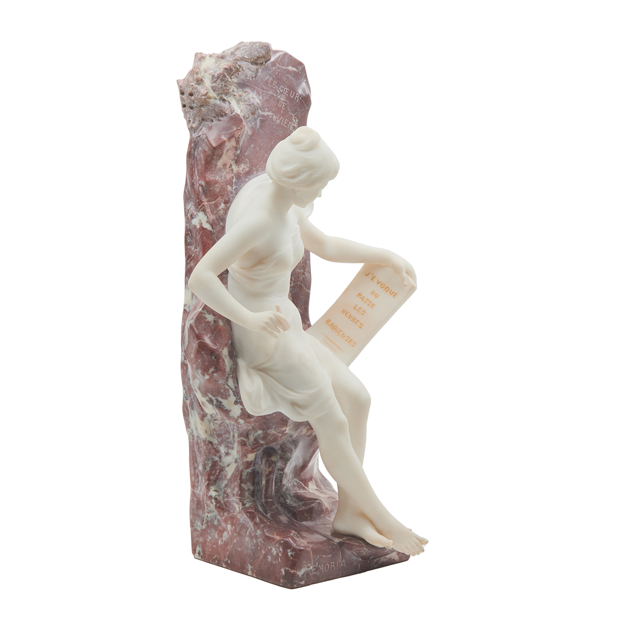 inscribed text on slab: Le Coeur Se Souvient, and slab in hand: JEvoque Du Passe Les Heures Radieuses.