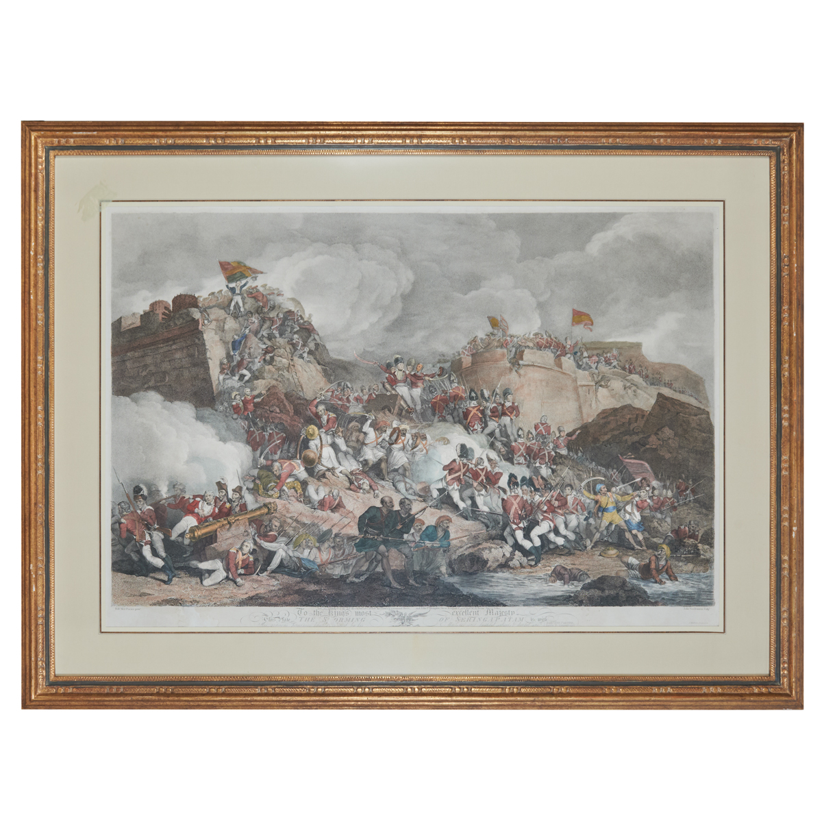 Notes: Frame has light wear, approximate dimensions - framed: 34-3/4 x 46-1/4 inches. Bio: Artist, author, and traveler, his early studies were at the Royal Academy. Fairly quickly he received a number of church commissions, leading to other works. His particular interest was the depiction of battle scenes, which continued to be exhibited at the Royal Academy. Having a strong interest in traveling and depicting what he encountered, he traveled to Russia and was appointed as historic painter to Tsar Alexander of Russia. Travels to Finland, Sweden and beyond resulted in his works appearing in books related to both world and military history.