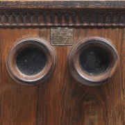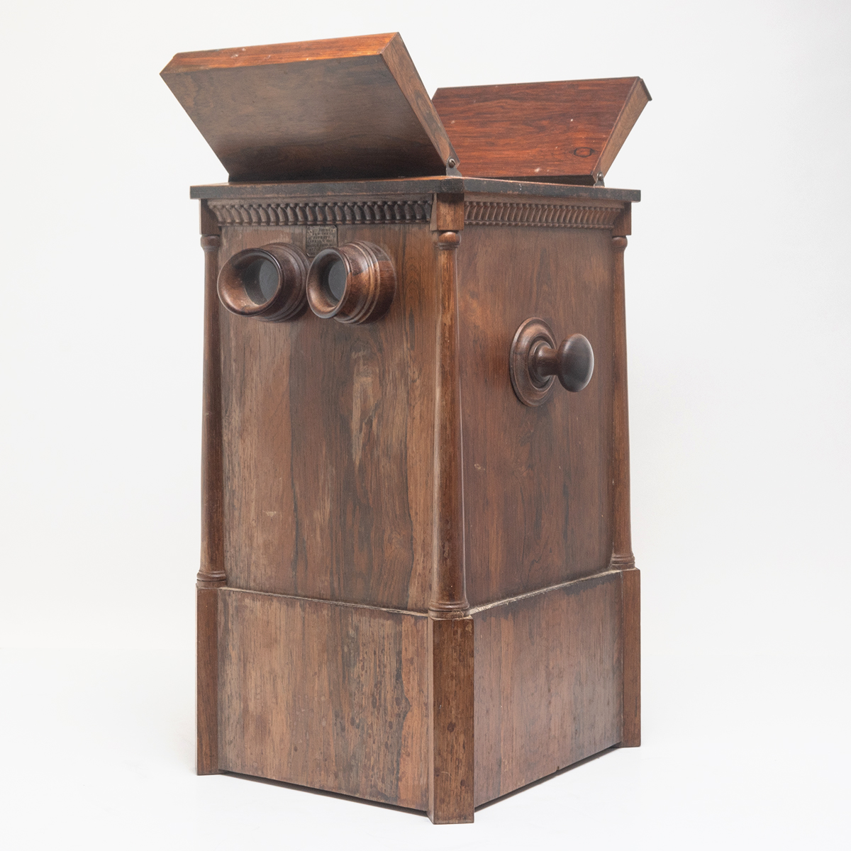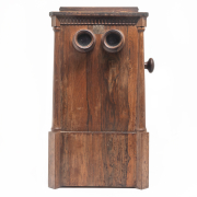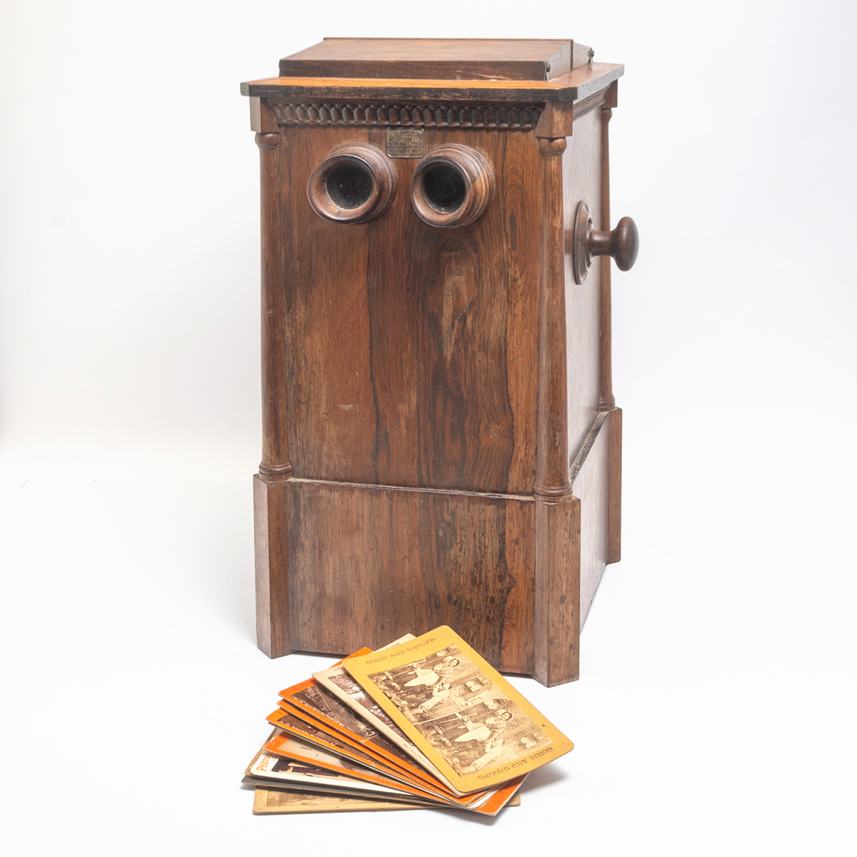 Rosewood case, glass lenses and window with cards installed and a small collection of additional cards card subjects are mostly novelty scenes but also include architecture and black Americans.