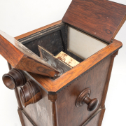 Condition: Some surface wear and wear to finish including fading and staining. Loss to veneer on upper door. The rotating card mechanism seems to be in working order.