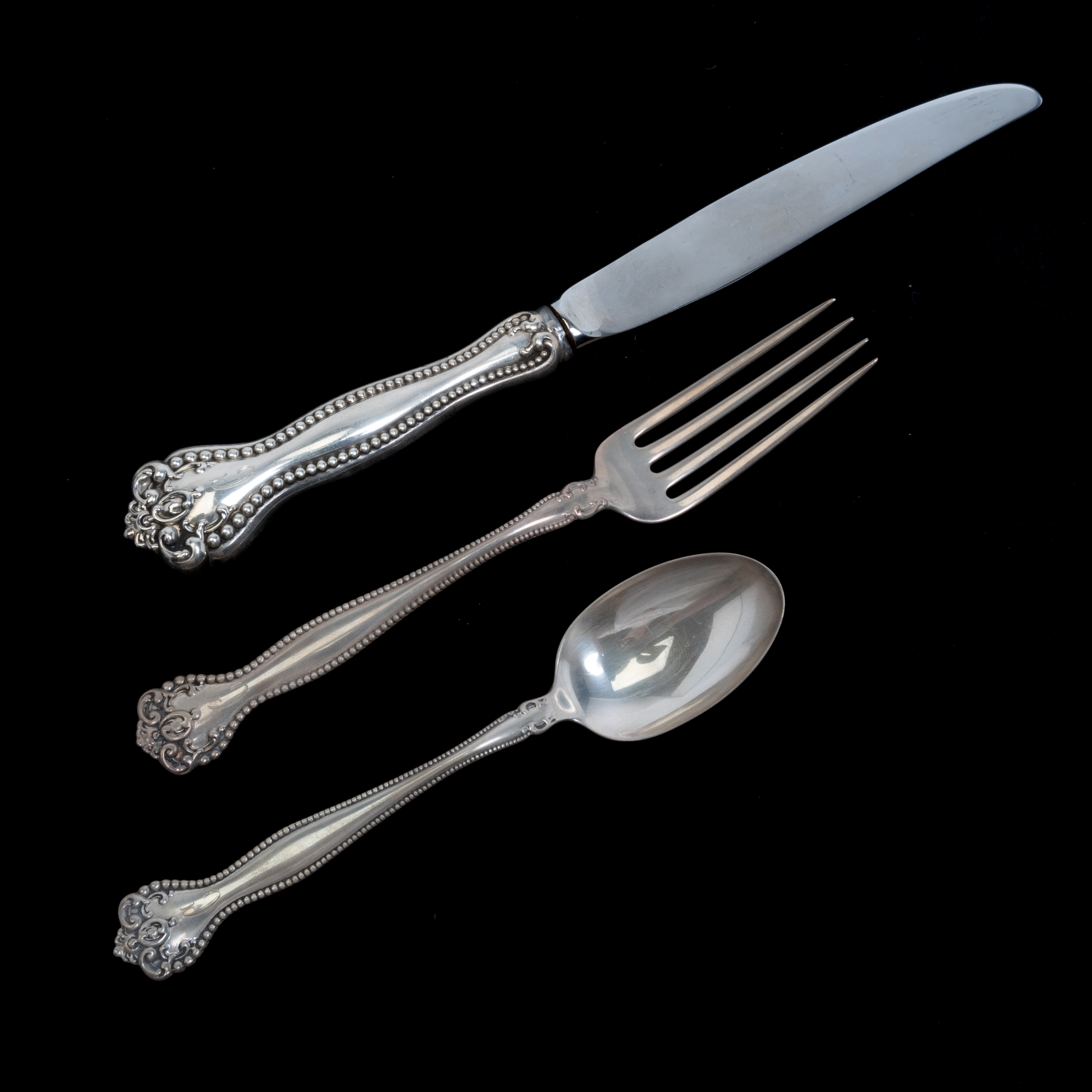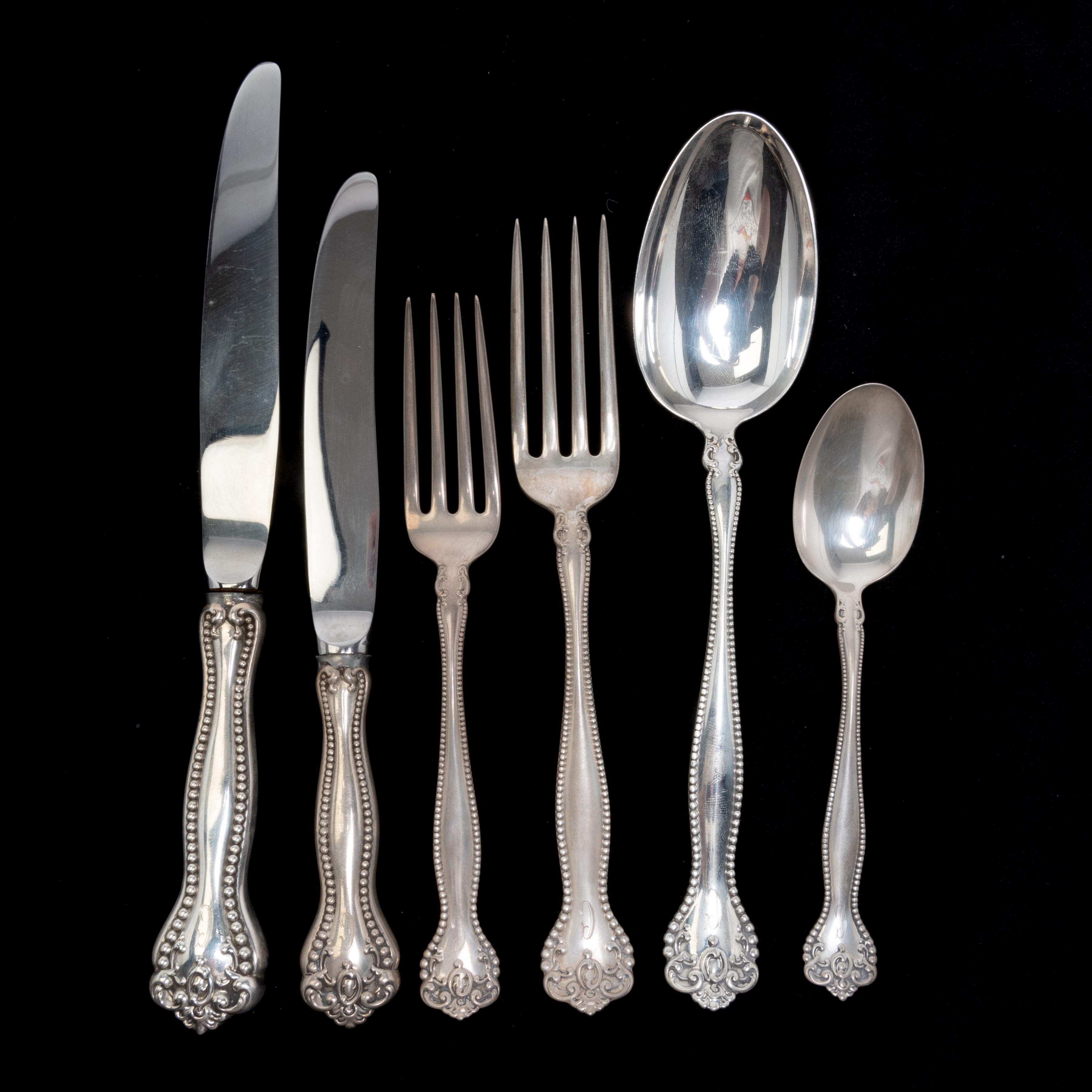 Comprising 12 place knives, 12 dessert knives, 12 place forks, 12 dessert forks, 12 teaspoons, 3 tablespoons. (63 pieces total).