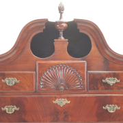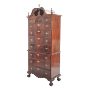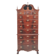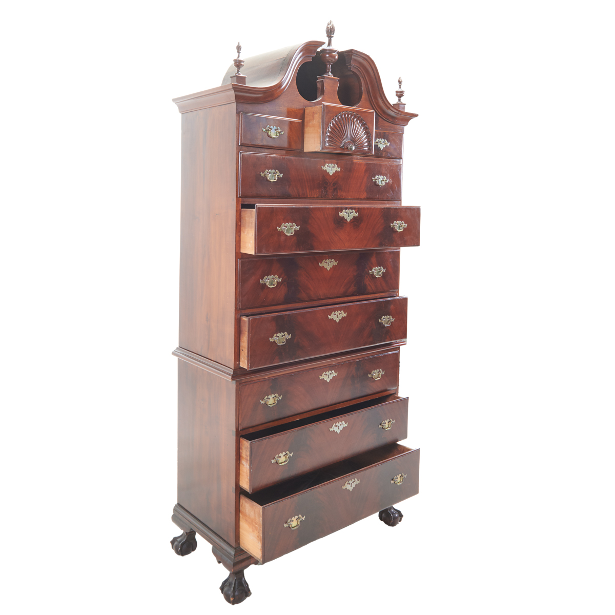 With later bonnet the top section with three short drawers over three long graduated drawers, the base with three long graduated drawers, shell carved apron, claw and ball feet later brass bat pulls and escutcheons.