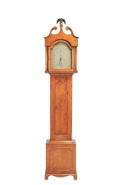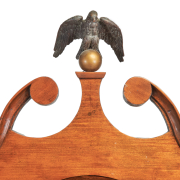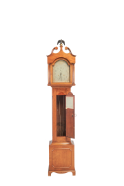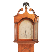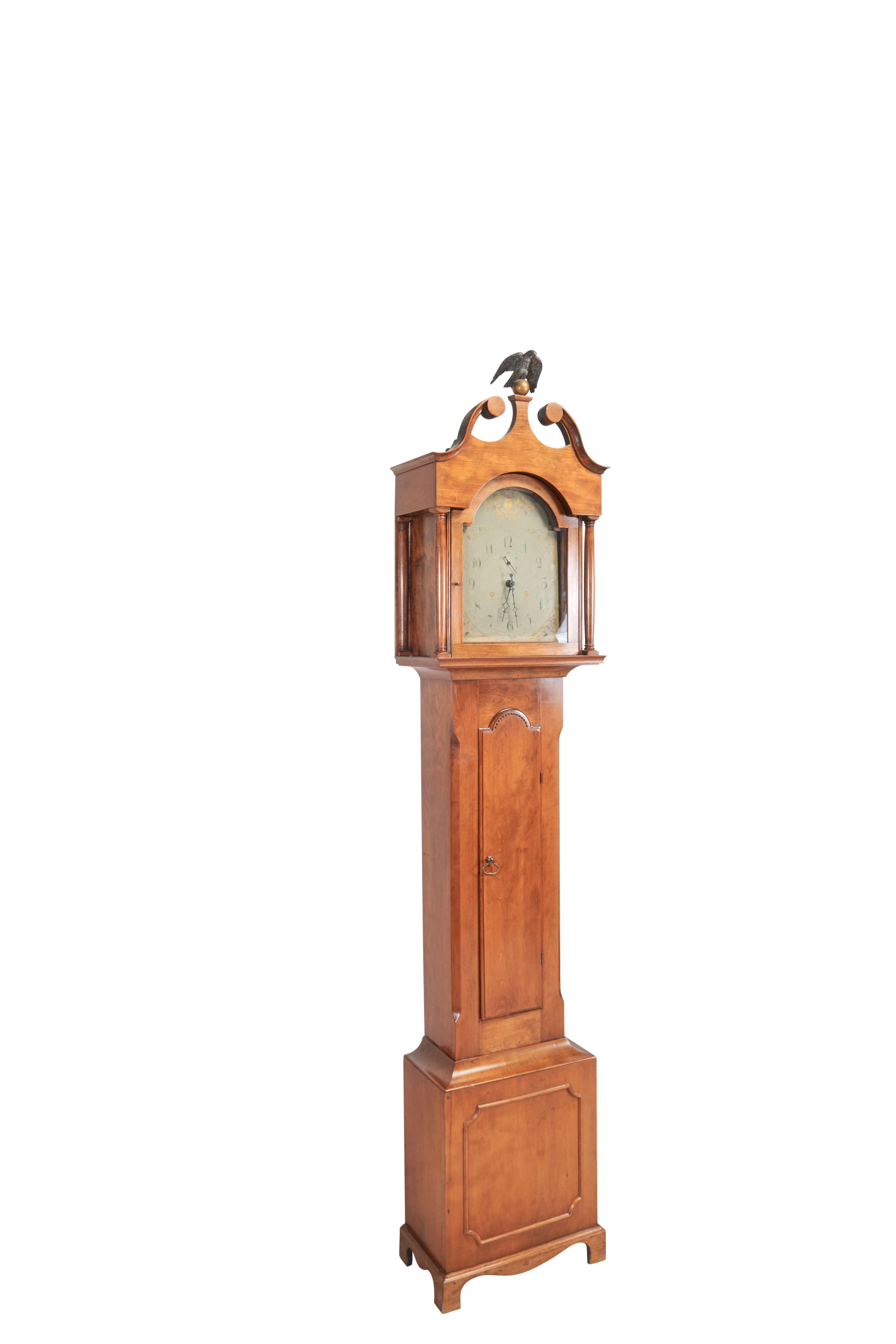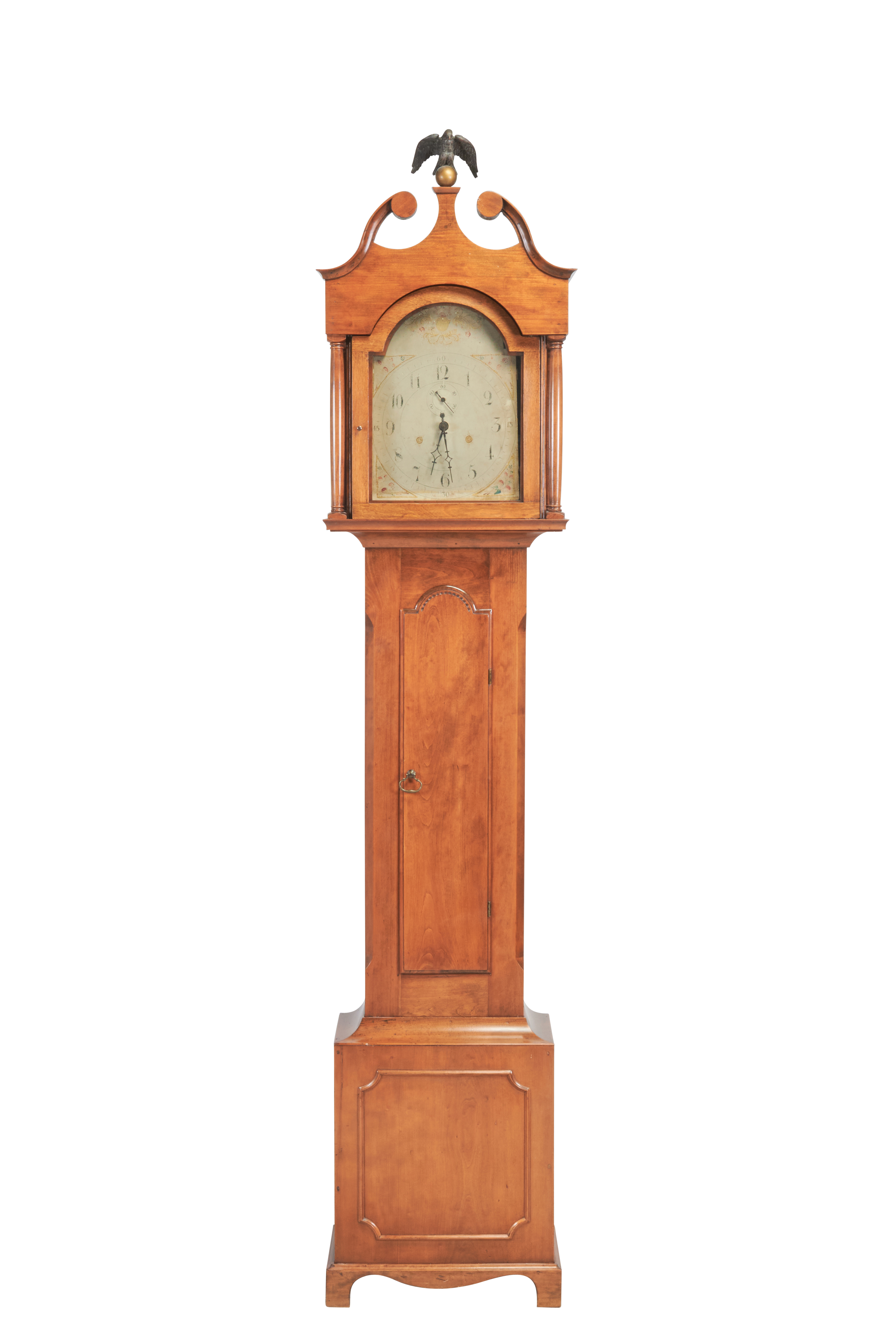Scrolled broken pediment crown centering eagle finials, painted dial two weights and pendulum included.
