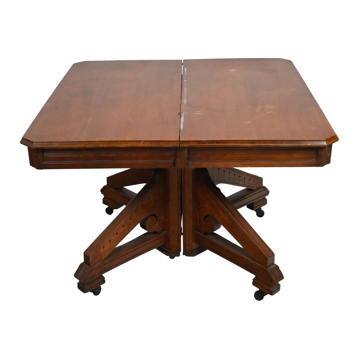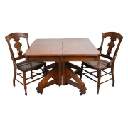 Condition: Table with surface wear throughout. One chair with break to the back, minor loss to back splat support. Surface wear throughout to chairs. One with repair to crown rail.