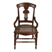 Comprising a dining table with leaves and six side chairs with caned seats.