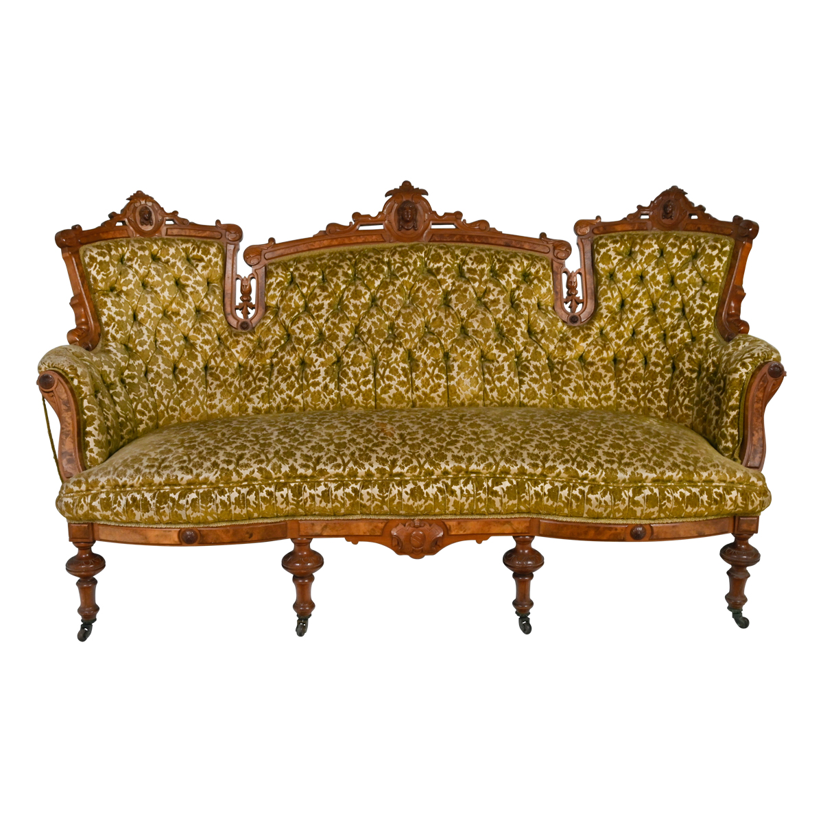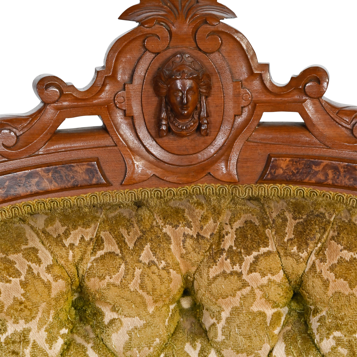 Condition: Loss to one head rail carving. Wear to upholstery includes fraying, hole to back of settee, and piping falling off. Minor wear to the frames.