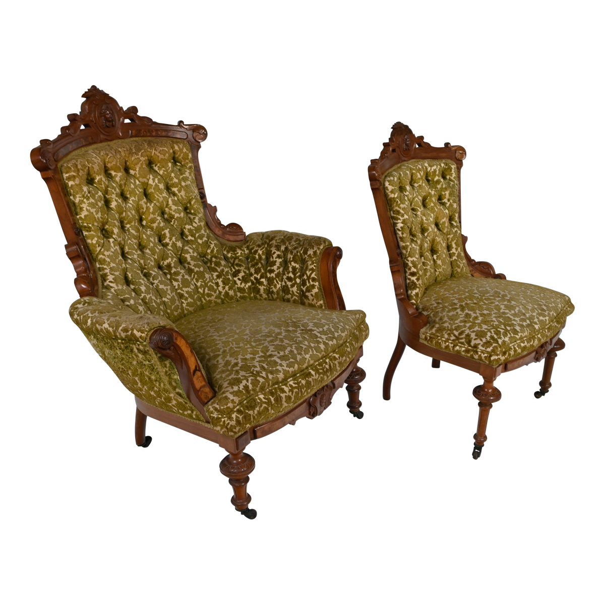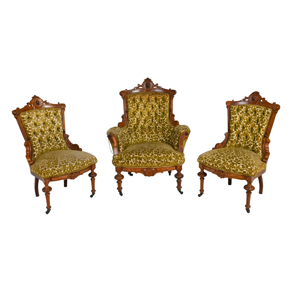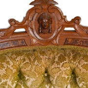 Comprising a settee, armchair, and two side chairs walnut, with floral green brocade upholstery, the carved frames with busts to the head-rails.