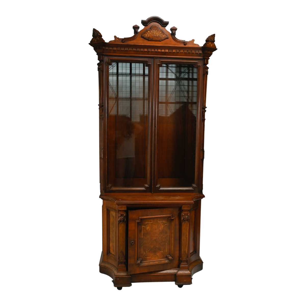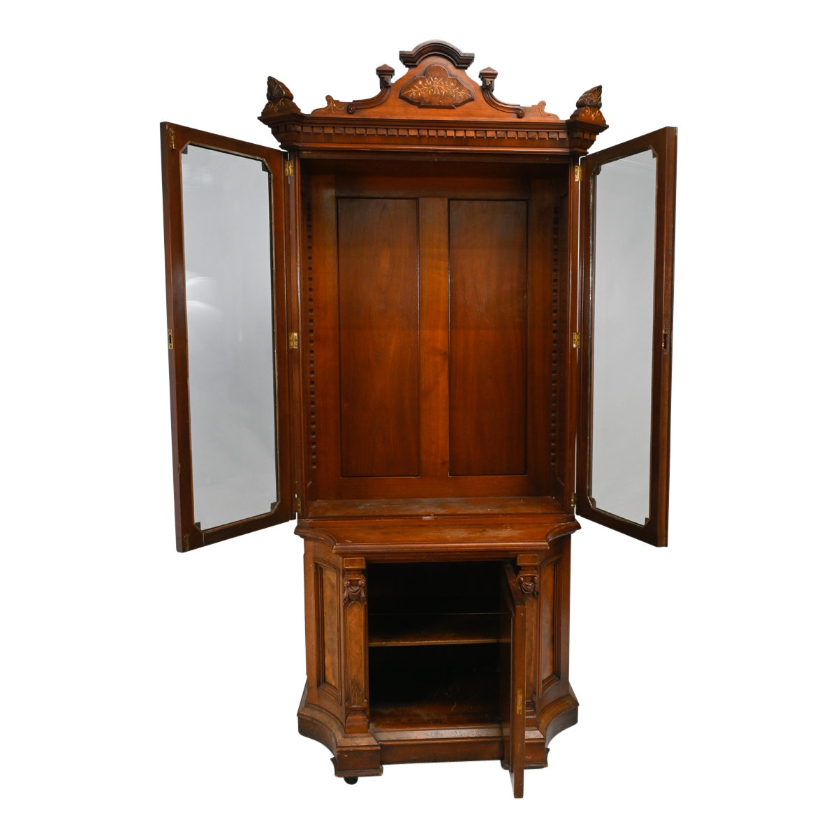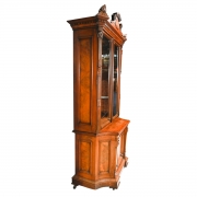 The bookcase section with two glazed doors, resting on a single door cabinet base on casters parcel gilt trim throughout.