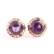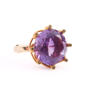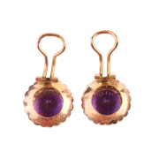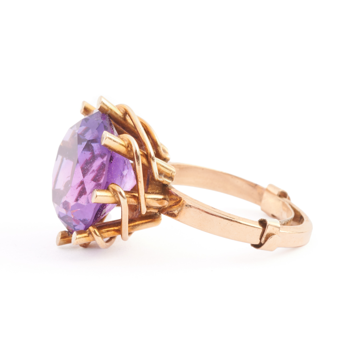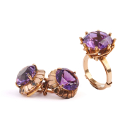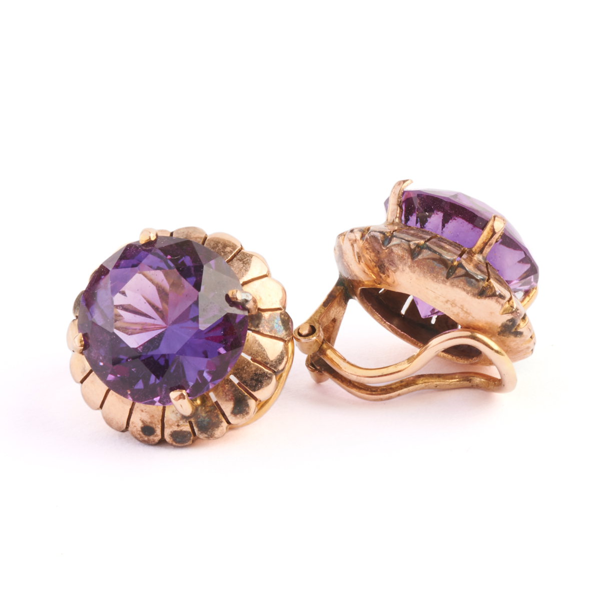 Including one round-cut amethyst, 14k yellow gold ring, size 7 1/2 (with insert) together with a pair of round-cut amethyst, 14k yellow gold non-pierced ear clips measuring approximately 18 mm.