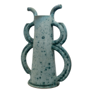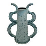 Tapered cylindrical body with looped handles, light blue textured matte glaze, glossy black glaze to the interior.