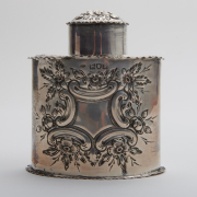 Comprising 1898 Horace Woodward Co. Ltd. can form caddy, 1906 Sibray Hall Co Ltd chased and repousse caddy, 1897 Charles Henry Dumenil chased and repousse caddy, 1907 chased and repousse caddy, 1905 Josiah Williams Co.caddy, 1924 Henry Matthews hinged lid caddy, cased set of six 1933 Thomas Bradbury Sons Ltd demitasse spoons, set of five sterling handle fruit knives with five fruit forks, 6 additional spoons, 2 scoops with illegible rubbed marks.