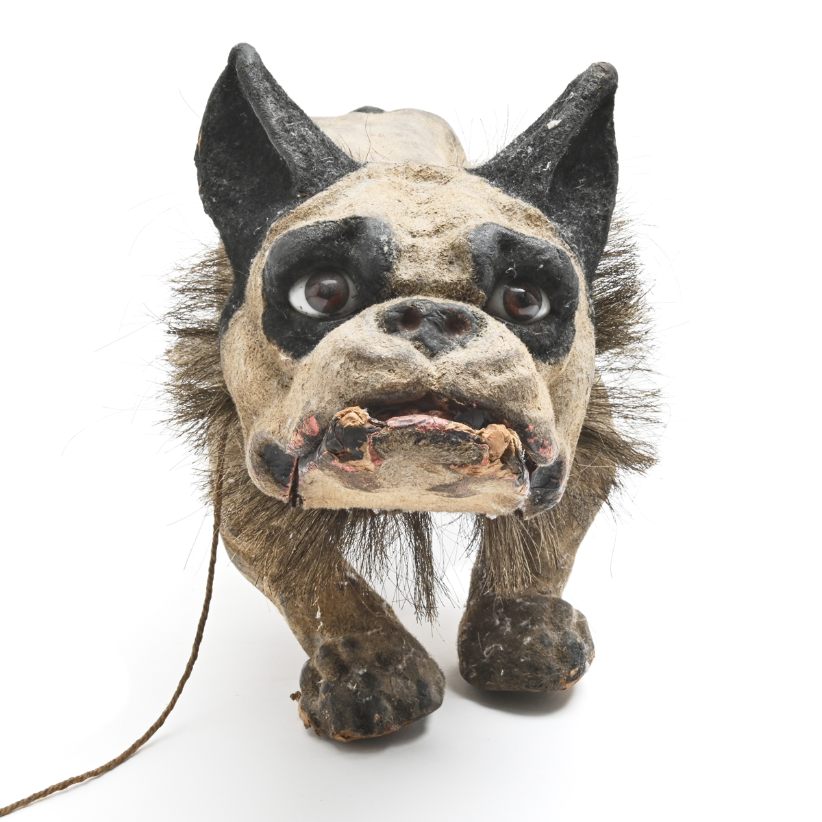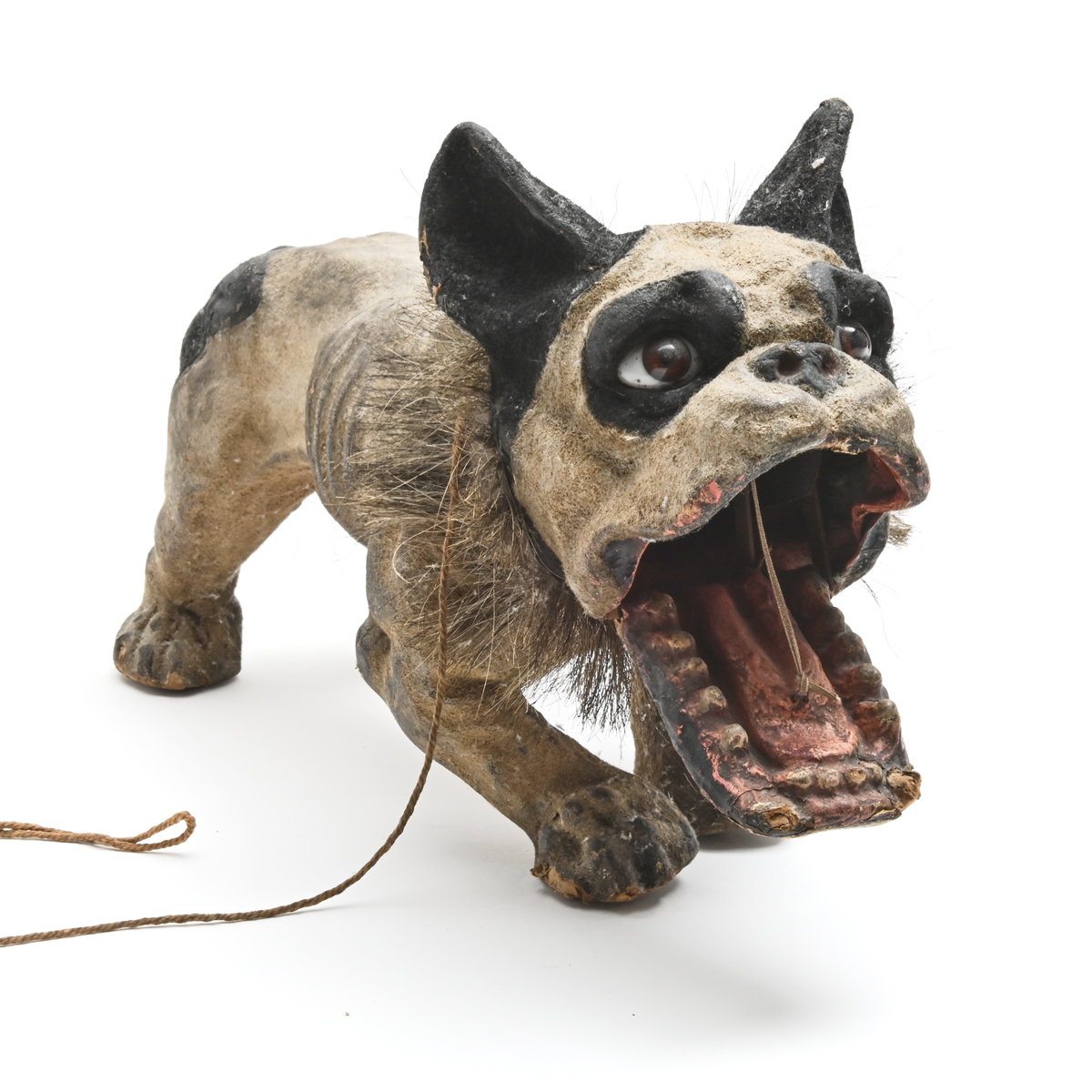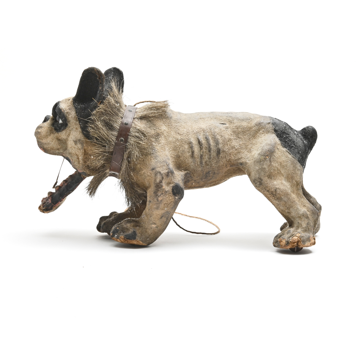 Condition: Some surface wear throughout, loss to fur. Some chips to papier mache, including teeth. Missing chain, later rope attached. Mouth stays open.