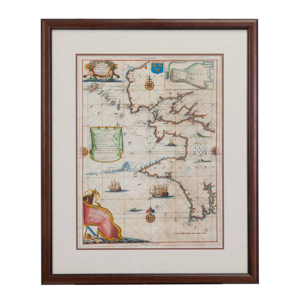 Coronelli, Vincenzo Maria (Italian, 1650-1718) inscription lower left reads CITTA, PORTO, E RADA DI BREST, Luoghi conuicini nella Bretagna oue Attualmente si troua LArmata di Sua Maesta Cristianissima, Descritte / Dal P. Maestro Coronelli, Lettore, e Cosmografo della Serenissima Republica di Venetia inscription top left reads Dedicata All Illmo, et Eccell: Sig: FRANCESCO SANUDO, Senatore Amplissimo nella Serenissima Republica de Venetia inscription to the left reads Osseruationi / Scolgi, o Banchi, che sono sempred coperti dal Mare / Scogli, o Banchi che alle uolte sono coperti altre, scoper ti dal mare / Scogli, o Banchi, che sono sempre scoperti . Le linee, che sono tirrate dalli pericoli principali del mare, e che uanno terminare nella Terra, oue sono alcuni contrasegni, sono per euitarli / in Venetia 1689 Ad usi dekkAcademia Cosmografica degli Argonauti.