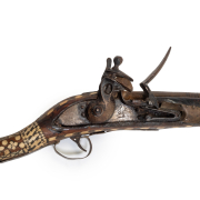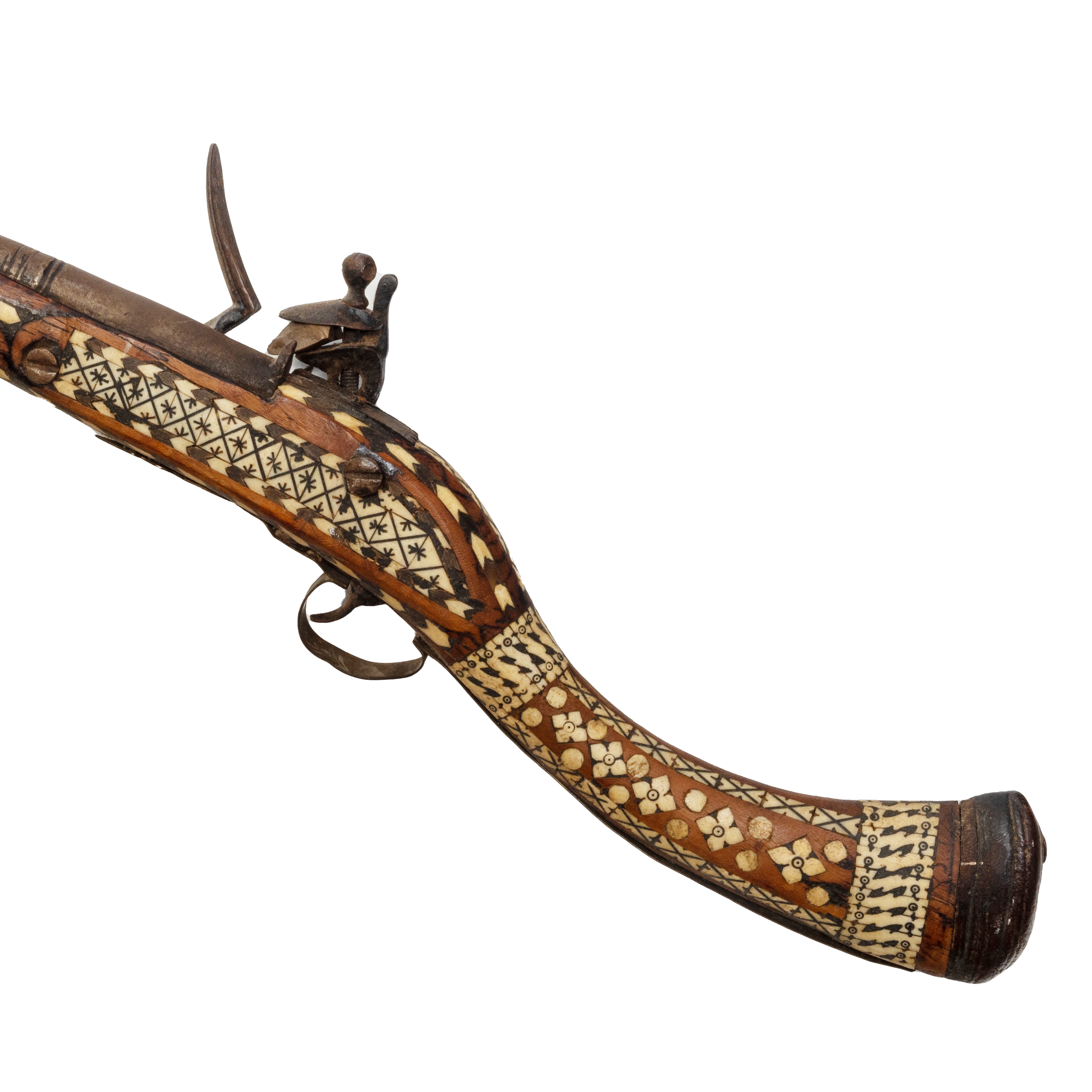 Condition: Significant wear and patina throughout including rust. Some fill-in repairs to wood loss, inlay. Apparent later hardware, namely a plate nailed to the lock plate. Ramrod with apparent loss to tamper end.
