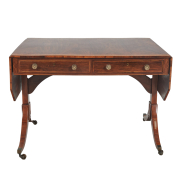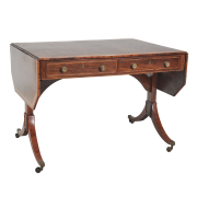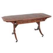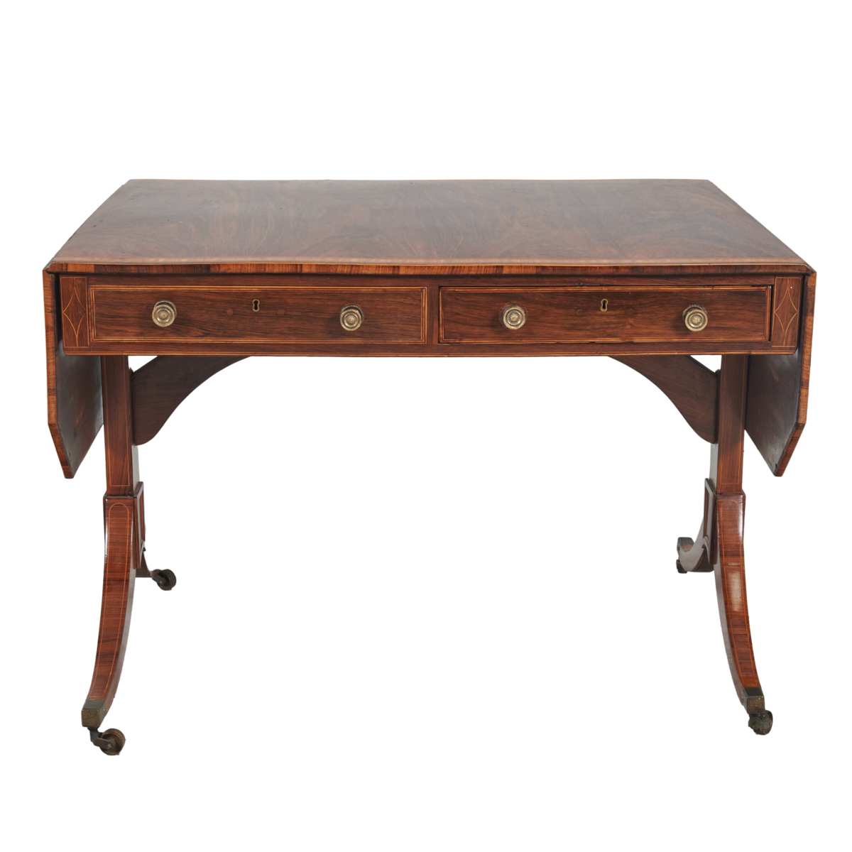 Drop-leaves on either side, drawers on either side with false drawer fronts opposite, on outswept legs with casters, banded inlay accents throughout.