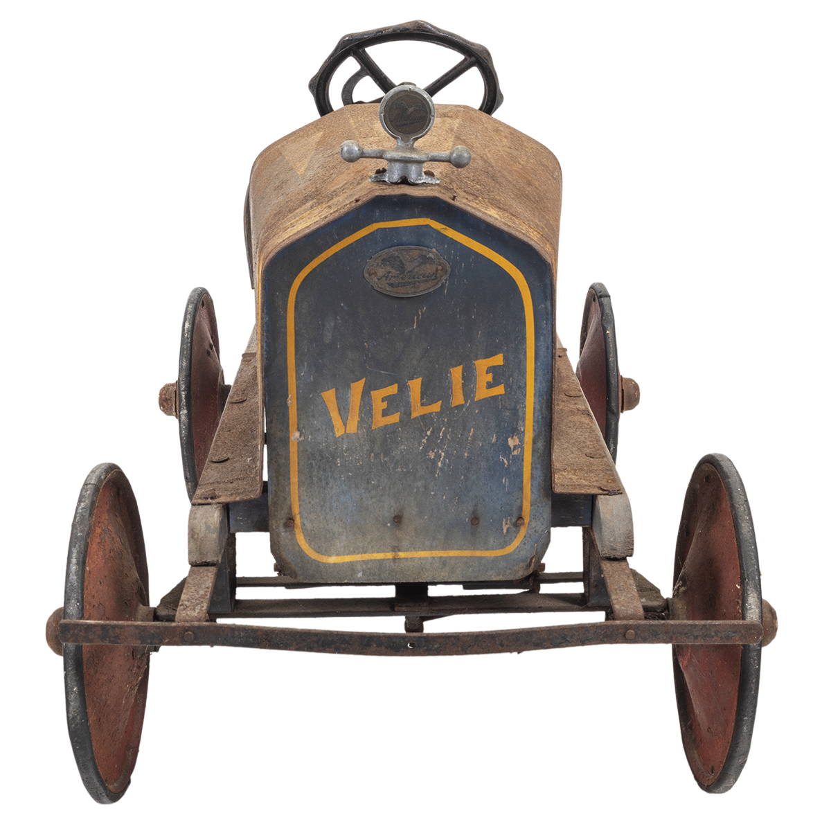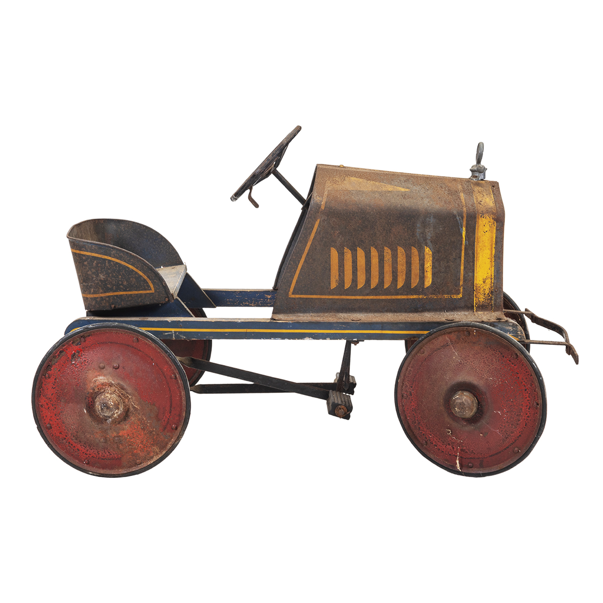 Green painted metal body with yellow accent, red wheels with black rubber tires.