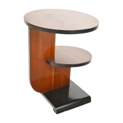 The round top with smaller round shelf beneath, ebonized base and ebonized trim to table top and shelf edges.