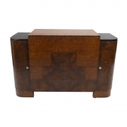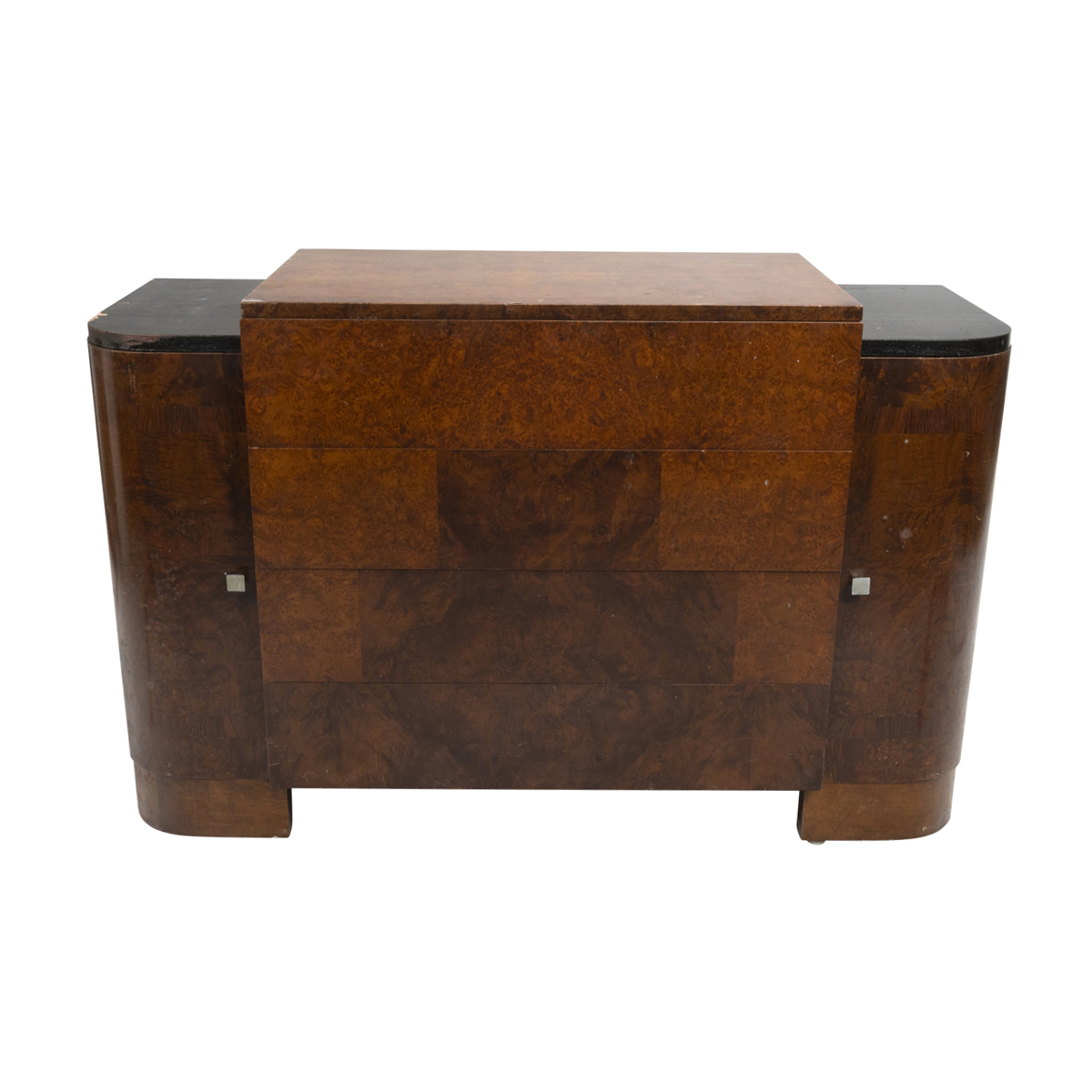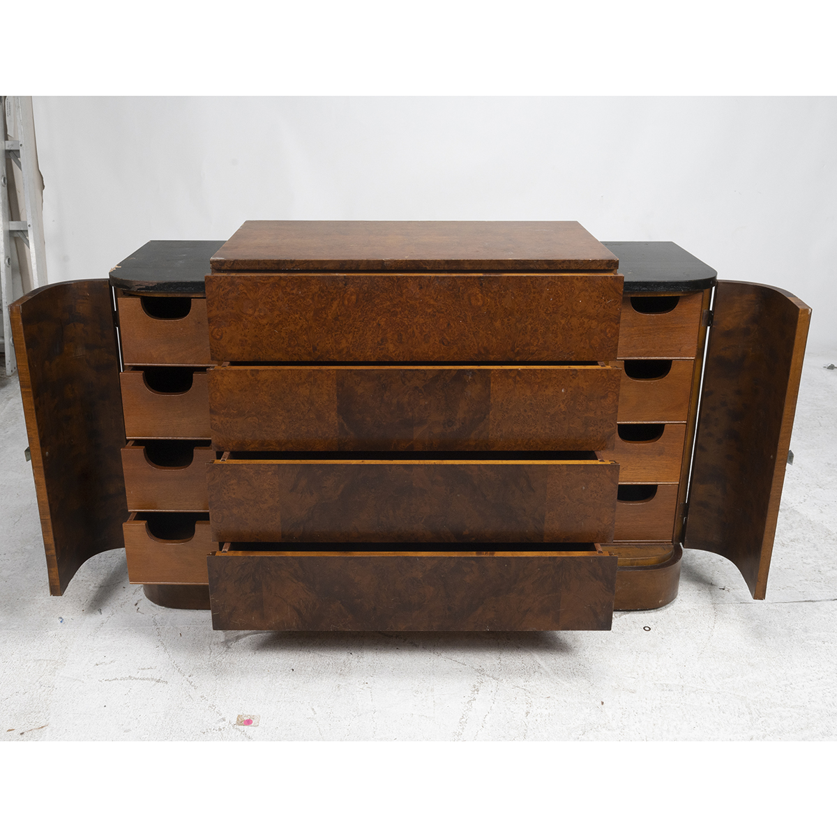 Burl veneer with ebonized sections to the top two curved single door cabinets to the sides conceal 4 small drawers, flanking four long drawers.